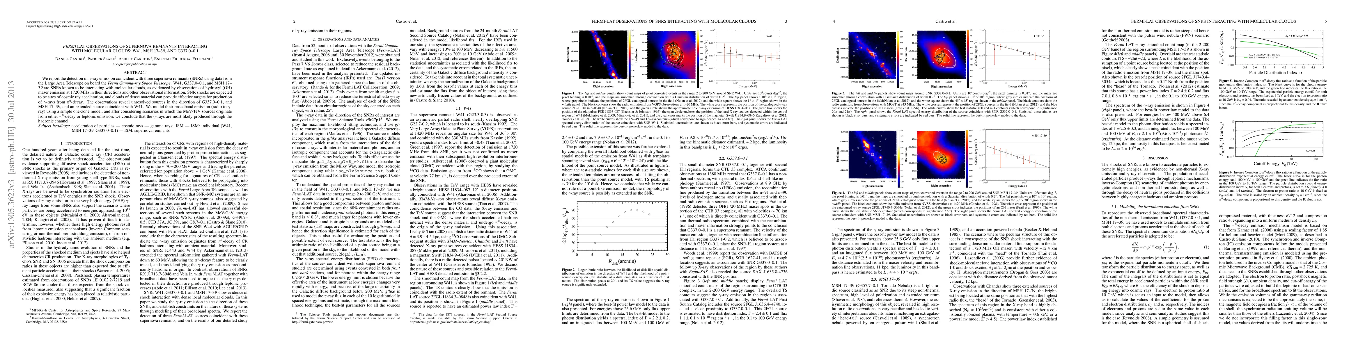 We report the detection of gamma-ray emission coincident with three supernova remnants (SNRs) using data from the Large Area Telescope on board the Fermi Gamma-ray Space Telescope. W41, MSH 17-39, and G337.0-0.1 are SNRs known to be interacting with molecular clouds, as evidenced by observations of hydroxyl (OH) maser emission at 1720 MHz in their directions and other observational information. SNR shocks are expected to be sites of cosmic ray acceleration, and clouds of dense material can provide effective targets for production of gamma-rays from neutral pion-decay. The observations reveal unresolved sources in the direction of G337.0-0.1, and MSH 17-39, and an extended source coincident with W41. We model their broadband emission (radio to gamma-ray) using a simple one-zone model, and after considering scenarios in which the MeV-TeV sources originate from either neutral pion-decay or leptonic emission, we conclude that the gamma-rays are most likely produced through the hadronic channel.