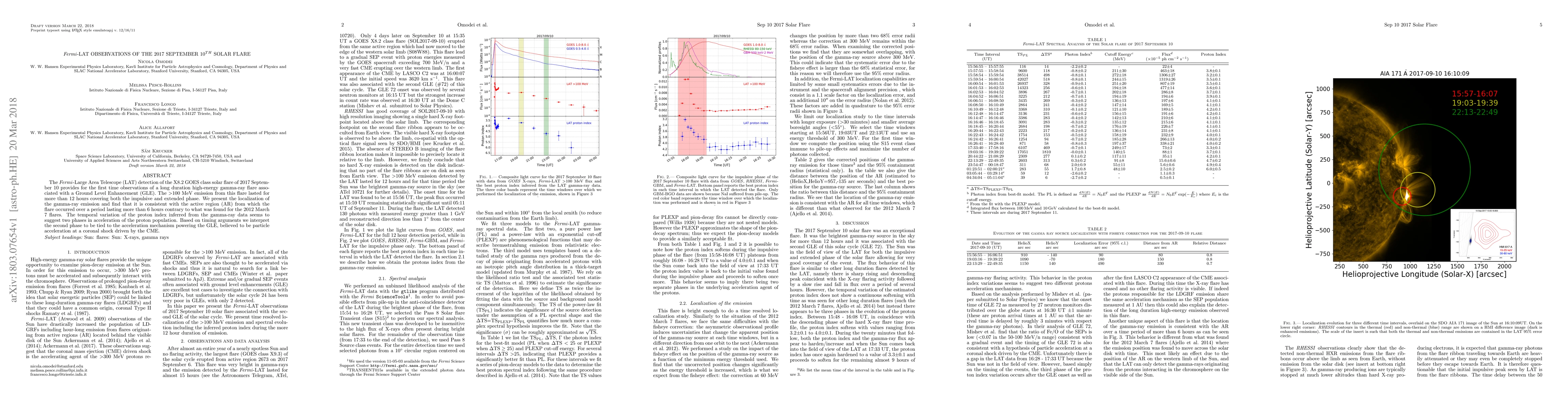 The Fermi-Large Area Telescope (LAT) detection of the X8.2 GOES class solar flare of 2017 September 10 provides for the first time observations of a long duration high-energy gamma-ray flare associated with a Ground Level Enhancement (GLE). The >100 MeV emission from this flare lasted for more than 12 hours covering both the impulsive and extended phase. We present the localization of the gamma-ray emission and find that it is consistent with the active region (AR) from which the flare occurred over a period lasting more than 6 hours contrary to what was found for the 2012 March 7 flares. The temporal variation of the proton index inferred from the gamma-ray data seems to suggest two phases in acceleration of the proton population. Based on timing arguments we interpret the second phase to be tied to the acceleration mechanism powering the GLE, believed to be particle acceleration at a coronal shock driven by the CME.