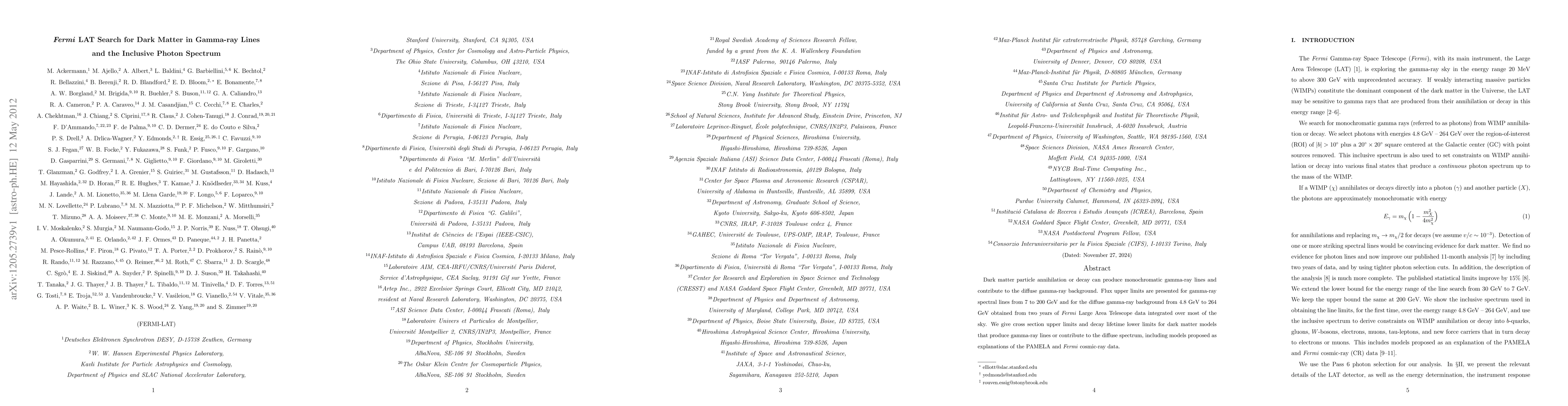 This paper reports on the Fermi LAT's search for dark matter signals in gamma-ray lines and the diffuse photon spectrum, presenting upper limits on gamma-ray flux and cross-section limits for various dark matter models, including those explaining PAMELA and Fermi cosmic-ray anomalies.