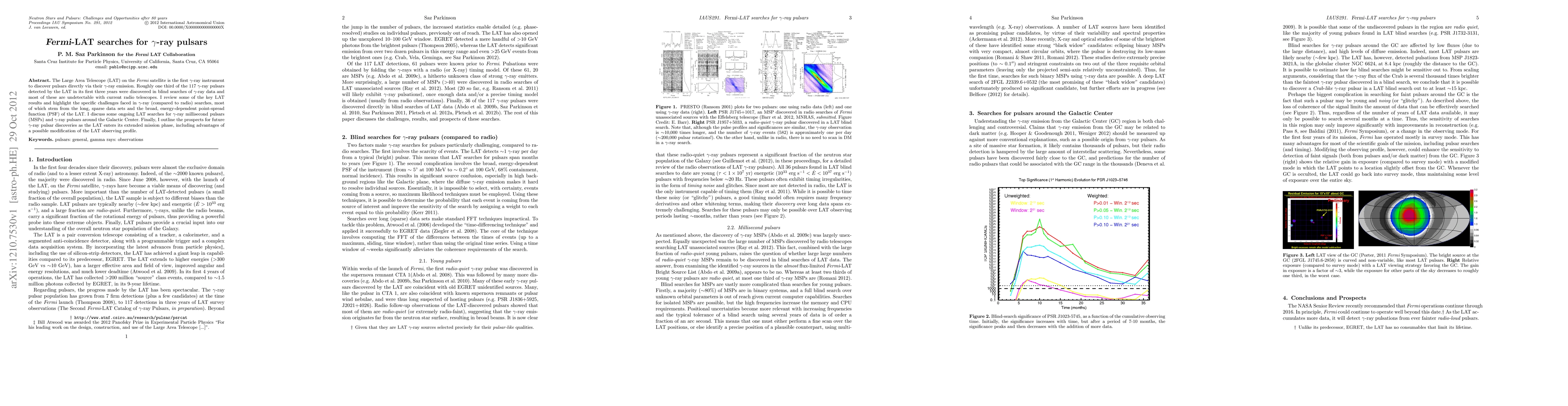 The Fermi-LAT has identified gamma-ray pulsars directly, discovering around one third through blind searches, which are undetectable via radio telescopes. The review highlights challenges in gamma-ray detection due to long, sparse data and the LAT's broad, energy-dependent PSF, and discusses ongoing searches for millisecond pulsars and pulsars around the Galactic Center.