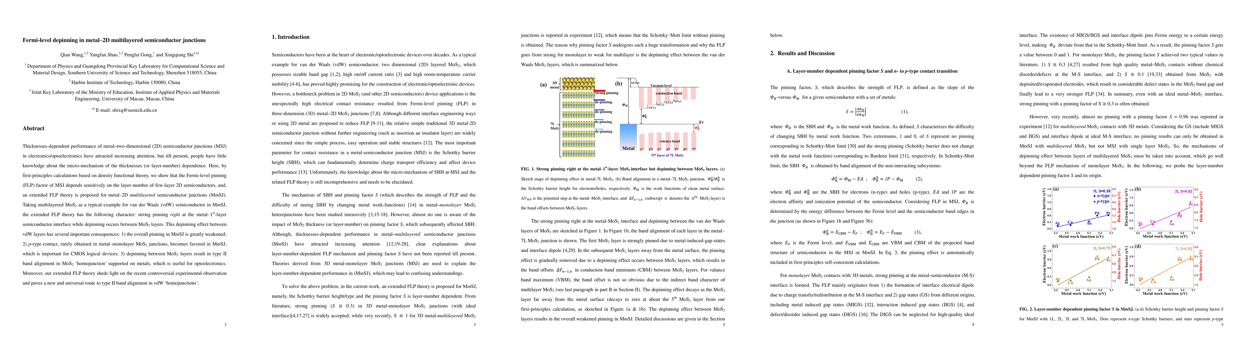 Thicknesses-dependent performance of metal-two-dimensional (2D) semiconductor junctions (MSJ) in electronics/optoelectronics have attracted increasing attention, but till present, people have little knowledge about the micro-mechanism of the thicknesses (or layer-number) dependence. Here, by first-principles calculations based on density functional theory, we show that the Fermi-level pinning (FLP) factor of MSJ depends sensitively on the layer-number of few-layer 2D semiconductors, and, an extended FLP theory is proposed for metal-2D multilayered semiconductor junctions (MmSJ). Taking multilayered MoS2 as a typical example for van der Waals (vdW) semiconductor in MmSJ, the extended FLP theory has the following character: strong pinning right at the metal-1st-layer semiconductor interface while depinning occurs between MoS2 layers. This depinning effect between vdW layers has several important consequences: 1) the overall pinning in MmSJ is greatly weakened; 2) p-type contact, rarely obtained in metal-monolayer MoS2 junctions, becomes favored in MmSJ, which is important for CMOS logical devices; 3) depinning between MoS2 layers result in type II band alignment in MoS2 'homojunction' supported on metals, which is useful for optoelectronics. Moreover, our extended FLP theory sheds light on the recent controversial experimental observation and paves a new and universal route to type II band alignment in vdW 'homojunctions'.