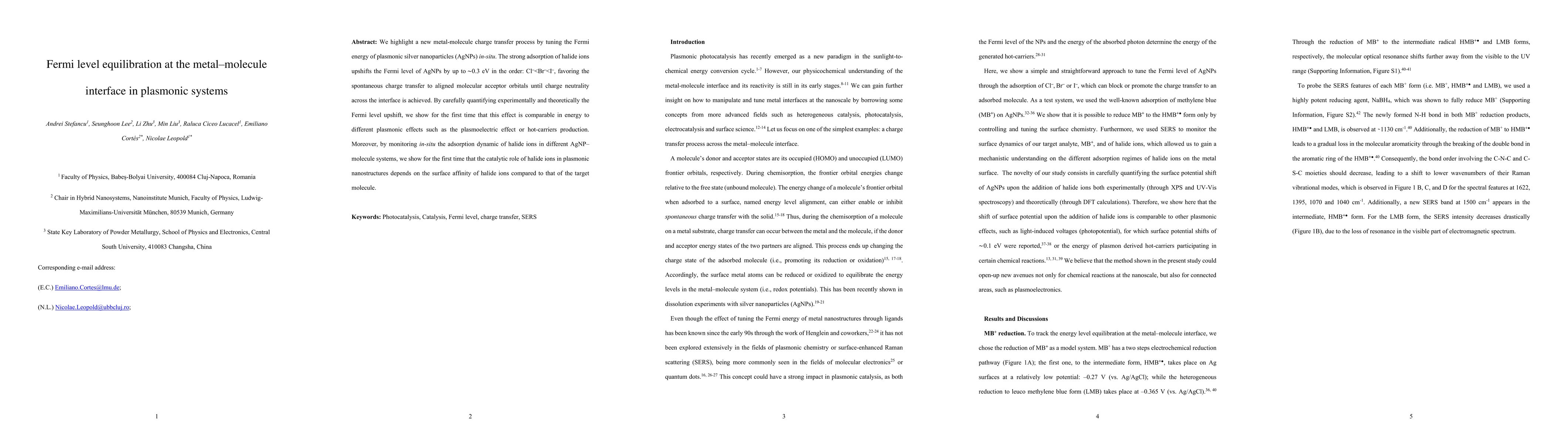 This research demonstrates a novel metal-molecule charge transfer process via Fermi level tuning in plasmonic silver nanoparticles (AgNPs), influenced by halide ion adsorption. The study reveals that halide ion affinity for AgNPs impacts their catalytic roles, with Fermi level upshift comparable to other plasmonic effects like plasmoelectric effect and hot-carrier production.
