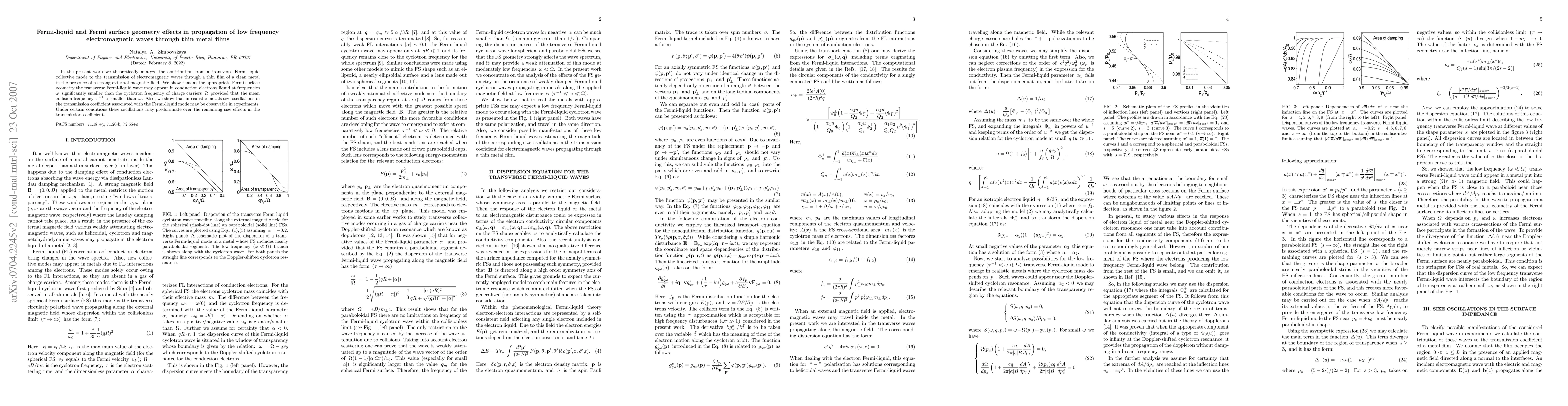 This paper theoretically investigates how a transverse Fermi-liquid collective mode influences the transmission of low-frequency electromagnetic waves through thin metal films under strong magnetic fields. It demonstrates that specific Fermi surface geometries can enable the appearance of these modes at frequencies much lower than the cyclotron frequency, provided the collision frequency is smaller than the wave frequency.