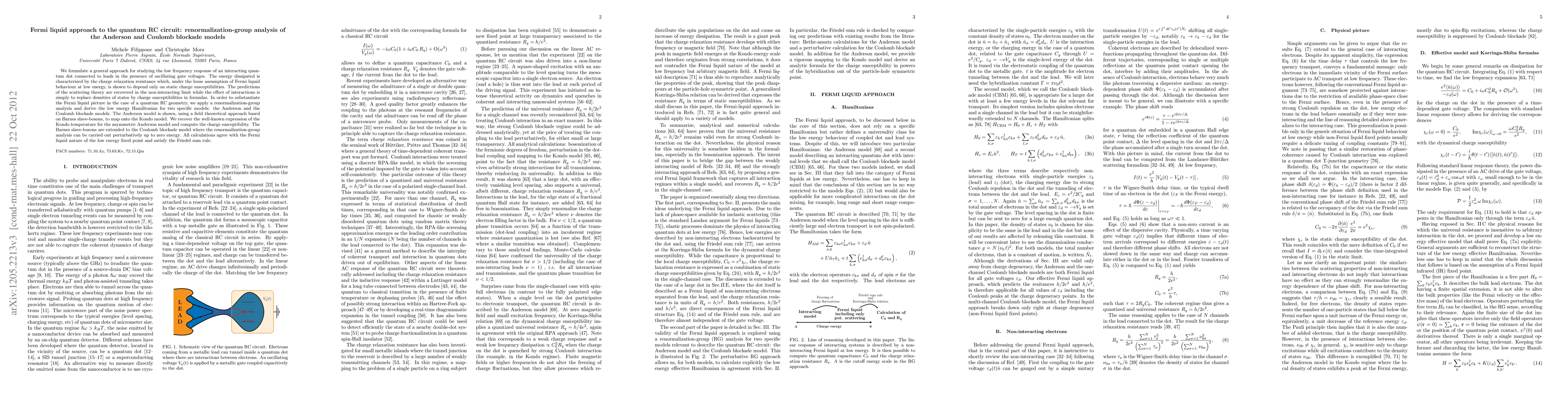 This paper develops a Fermi liquid approach to study the low-frequency response of an interacting quantum dot in a quantum RC circuit, applying renormalization-group analysis to the Anderson and Coulomb blockade models. The Fermi liquid behavior is substantiated through a field theoretical approach, mapping the Anderson model onto the Kondo model and confirming the Kondo temperature.