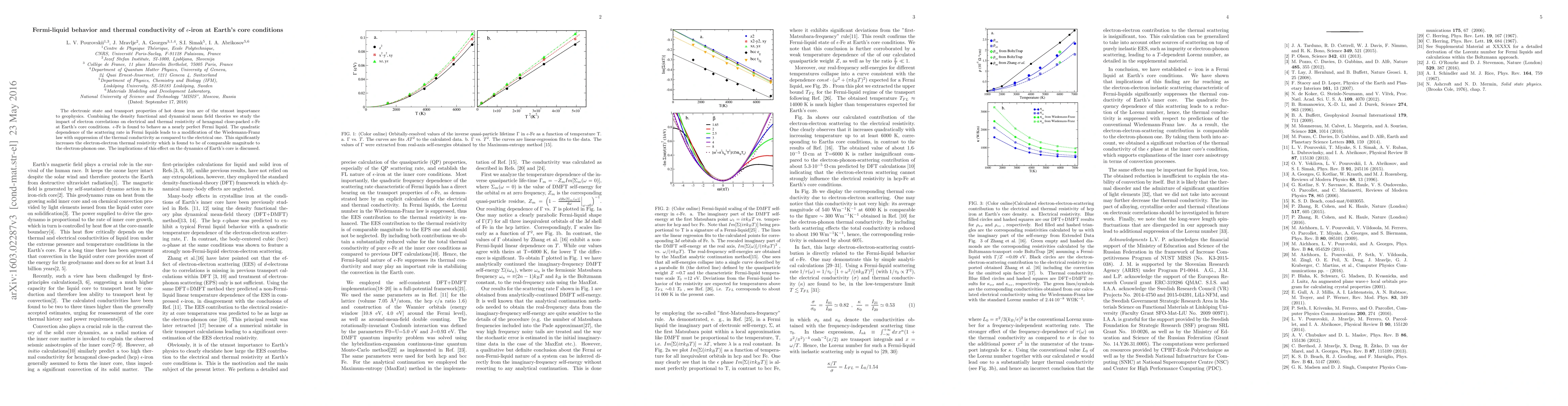 This study combines density functional and dynamical mean field theories to investigate the Fermi-liquid behavior and thermal conductivity of hexagonal close-packed $\epsilon$-iron under Earth's core conditions, revealing a significant suppression of thermal conductivity relative to electrical conductivity due to electron-electron interactions. The findings have implications for understanding the dynamics of Earth's core.