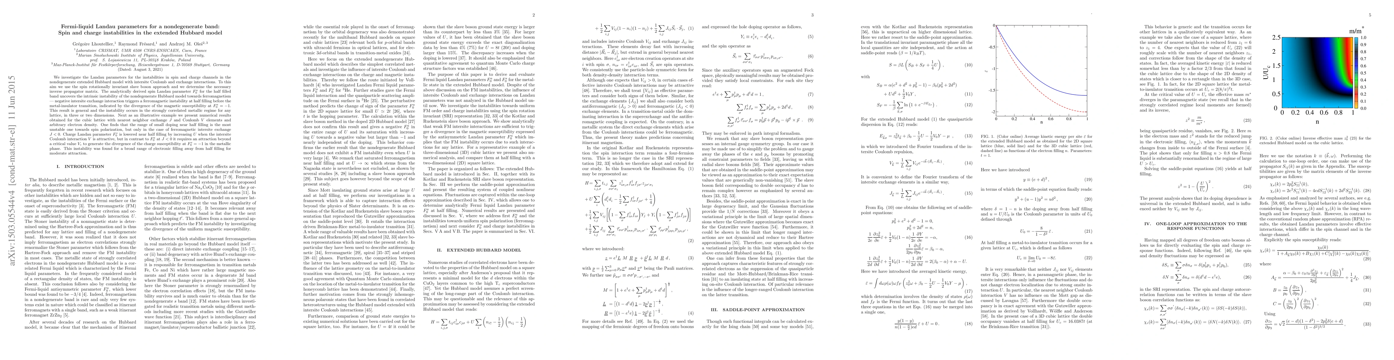 We investigate the Landau parameters for the instabilities in spin and charge channels in the nondegenerate extended Hubbard model with intersite Coulomb and exchange interactions. To this aim we use the spin rotationally invariant slave boson approach and we determine the necessary inverse propagator matrix. The analytically derived spin Landau parameter $F_0^a$ for the half filled band uncovers the intrinsic instability of the nondegenerate Hubbard model towards ferromagnetism --- negative intersite exchange interaction triggers a ferromagnetic instability at half filling before the metal-insulator transition, indicated by the divergence of the magnetic susceptibility at $F_0^a=-1$. This result is general and the instability occurs in the strongly correlated metallic regime for any lattice, in three or two dimensions. Next as an illustrative example we present numerical results obtained for the cubic lattice with nearest neighbor exchange $J$ and Coulomb $V$ elements and arbitrary electron density. One finds that the range of small doping near half filling is the most unstable one towards spin polarization, but only in the case of ferromagnetic intersite exchange $J<0$. Charge Landau parameter $F_0^s$ is lowered near half filling by increasing $U$ when the intersite Coulomb interaction $V$ is attractive, but in contrast to $F_0^a$ at $J<0$ it requires an attraction beyond a critical value $V_c$ to generate the divergence of the charge susceptibility at $F_0^s=-1$ in the metallic phase. This instability was found for a broad range of electronic filling away from half filling for moderate attraction.