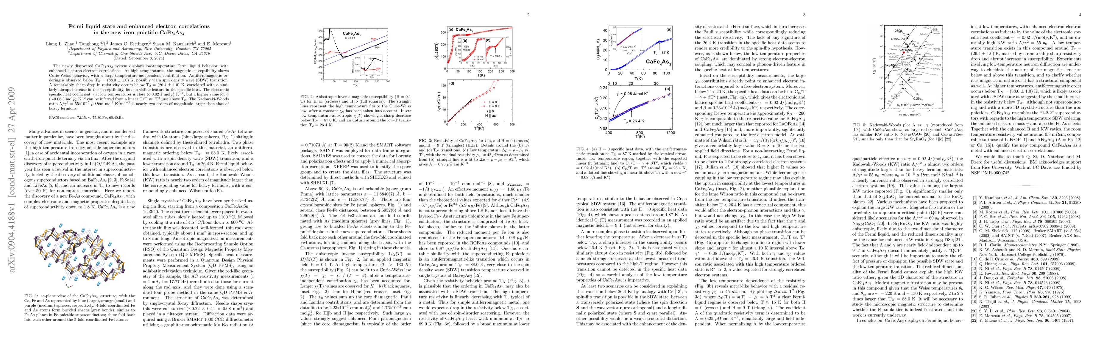 The newly discovered CaFe$_4$As$_3$ system displays low-temperature Fermi liquid behavior, with enhanced electron-electron correlations. At high temperatures, the magnetic susceptibility shows Curie-Weiss behavior, with a large temperature-independent contribution. Antiferromagnetic ordering is observed below T$_N$ = (88.0 $\pm$ 1.0) K, possibly via a spin density wave (SDW) transition. A remarkably sharp drop in resistivity occurs below T$_2$ = (26.4 $\pm$ 1.0) K, correlated with a similarly abrupt increase in the susceptibility, but no visible feature in the specific heat. The electronic specific heat coefficient $\gamma$ at low temperatures is close to 0.02 J mol$^{-1}_{Fe}$ K$^{-2}$, but a higher value for $\gamma$ ($\sim$0.08 J mol$^{-1}_{Fe}$ K$^{-2}$ can be inferred from a linear C$ / $T \textit{vs.} T$^2$ just above T$_2$. The Kadowaki-Woods ratio A$/\gamma^2$ = 55$*10^{-5}$ $\mu \Omega$cm mol$^2$ K$^2 $mJ$^{-2}$ is nearly two orders of magnitude larger than that of heavy fermions.