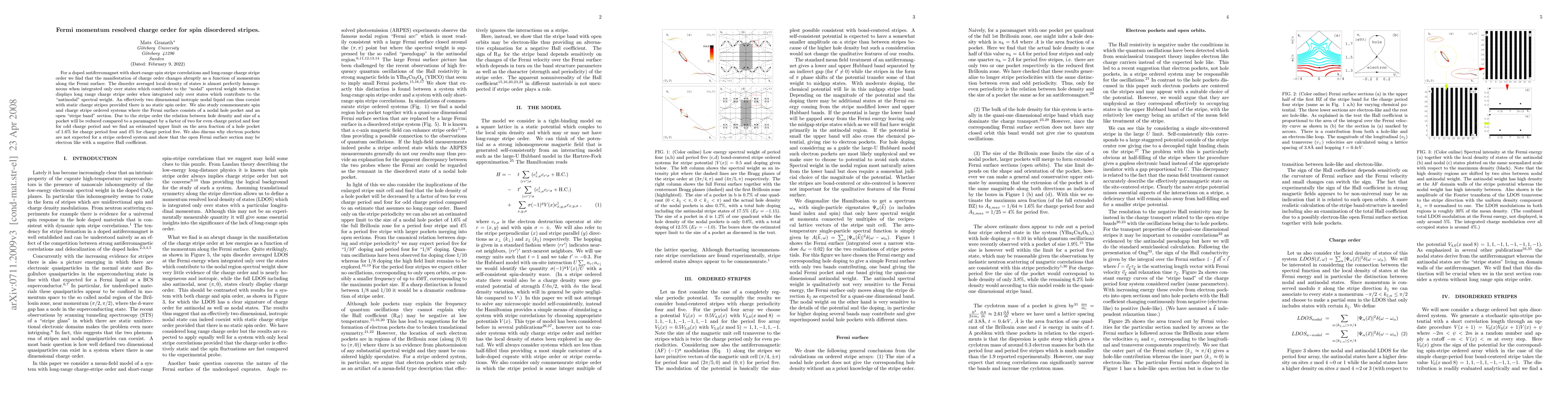 For a doped antiferromagnet with short-range spin stripe correlations and long-range charge stripe order we find that the manifestation of charge order changes abruptly as a function of momentum along the Fermi surface. The disorder averaged local density of states is almost perfectly homogeneous when integrated only over states which contribute to the ``nodal'' spectral weight whereas it displays long range charge stripe order when integrated only over states which contribute to the ``antinodal'' spectral weight. An effectively two dimensional nodal liquid can thus coexist with static charge stripes provided there is no static spin order. We also study commensurate spin and charge stripe ordered systems where the Fermi surface consists of a nodal hole pocket and an open ``stripe band'' section. Due to the stripe order the relation between hole density and size of a pocket will be reduced compared to a paramagnet by a factor of two for even charge period and four for odd charge period and we find an estimated upper limit on the area fraction of a hole pocket of 1.6% for charge period four and 4% for charge period five. We also discuss why electron pockets are not expected for a stripe ordered system and show that the open Fermi surface section may be electron like with a negative Hall coefficient.