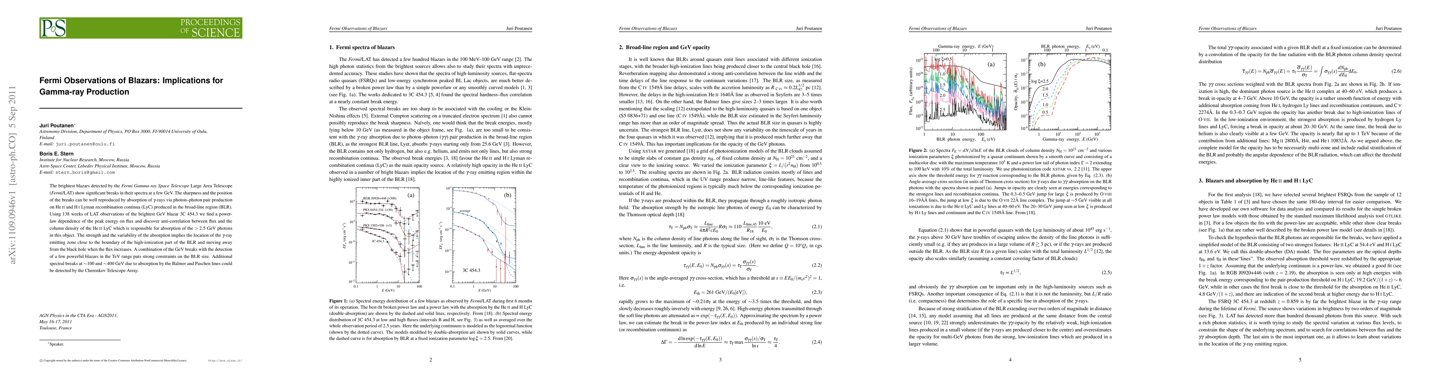 The brightest blazars detected by the Fermi Gamma-ray Space Telescope Large Area Telescope (Fermi/LAT) show significant breaks in their spectra at a few GeV. The sharpness and the position of the breaks can be well reproduced by absorption of $\gamma$-rays via photon--photon pair production on He ii and H i Lyman recombination continua (LyC) produced in the broad-line region (BLR). Using 138 weeks of LAT observations of the brightest GeV blazar 3C 454.3 we find a power-law dependence of the peak energy on flux and discover anti-correlation between flux and the column density of the He ii LyC which is responsible for absorption of the >2.5 GeV photons in this object. The strength and the variability of the absorption implies the location of the gamma-ray emitting zone close to the boundary of the high-ionization part of the BLR and moving away from the black hole when the flux increases. A combination of the GeV breaks with the detection of a few powerful blazars in the TeV range puts strong constraints on the BLR size. Additional spectral breaks at ~100 and ~400 GeV due to absorption by the Balmer and Paschen lines could be detected by the Cherenkov Telescope Array.