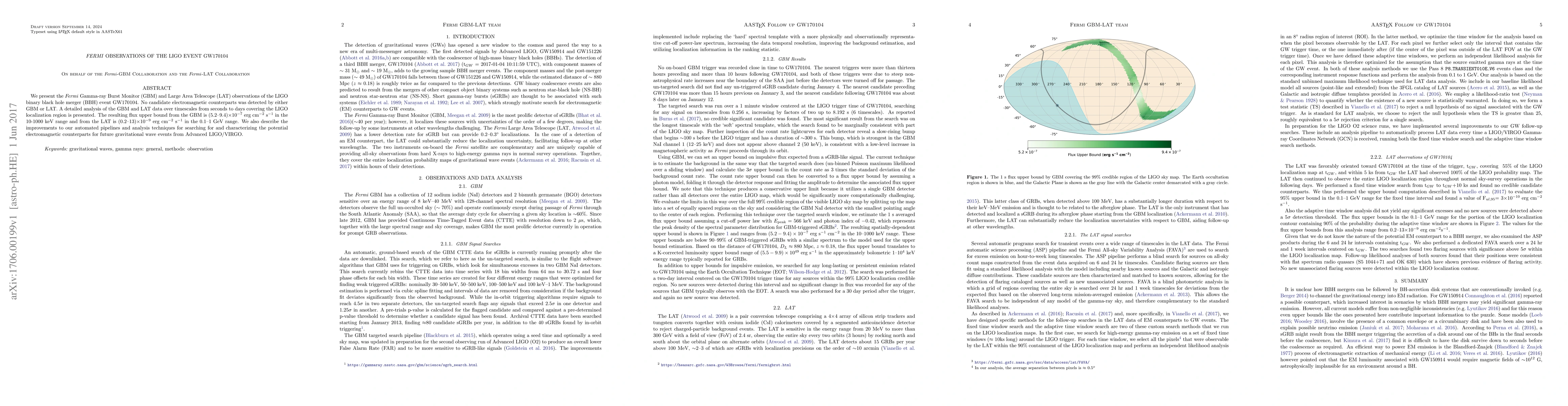 We present the \emph{Fermi} Gamma-ray Burst Monitor (GBM) and Large Area Telescope (LAT) observations of the LIGO binary black hole merger (BBH) event GW170104. No candidate electromagnetic counterparts was detected by either GBM or LAT. A detailed analysis of the GBM and LAT data over timescales from seconds to days covering the LIGO localization region is presented. The resulting flux upper bound from the GBM is (5.2--9.4)$\times$10$^{-7}$ erg cm$^{-2}$ s$^{-1}$ in the 10-1000 keV range and from the LAT is (0.2--13)$\times$10$^{-9}$ erg cm$^{-2}$ s$^{-1}$ in the 0.1--1 GeV range. We also describe the improvements to our automated pipelines and analysis techniques for searching for and characterizing the potential electromagnetic counterparts for future gravitational wave events from Advanced LIGO/VIRGO.
