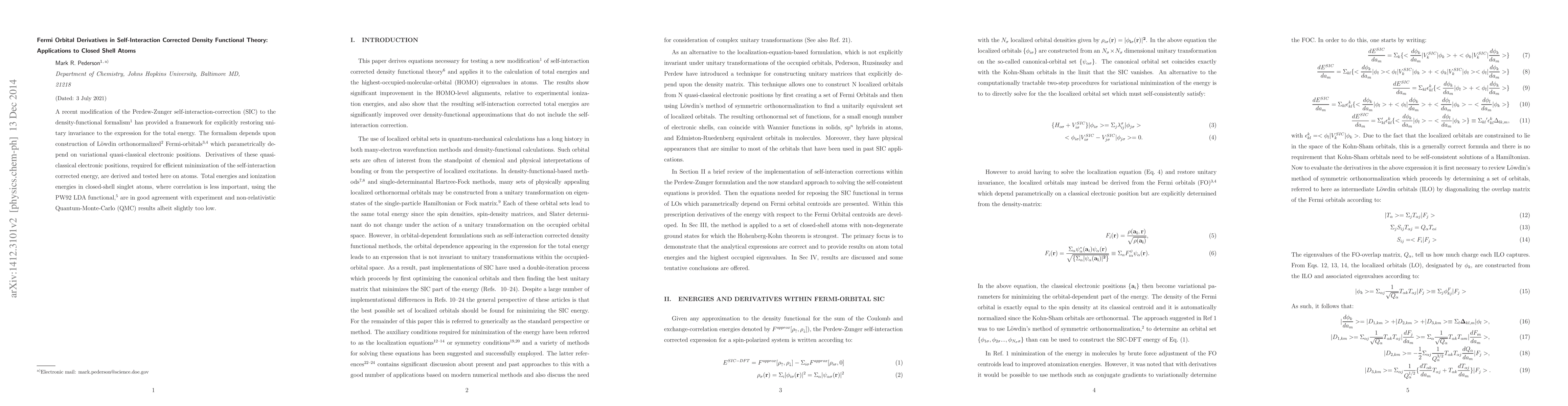 A recent modification of the Perdew-Zunger self-interaction-correction (SIC) to the density-functional formalism (Pederson, Ruzsinszky, Perdew) has provided a framework for explicitly restoring unitary invariance to the expression for the total energy. The formalism depends upon construction of Lowdin orthonormalized Fermi-orbitals (Luken et al) which parametrically depend on variational quasi-classical electronic positions. Derivatives of these quasi-classical electronic positions, required for efficient minimization of the self-interaction corrected energy, are derived and tested here on atoms. Total energies and ionization energies in closed-shell atoms, where correlation is less important, using the PW92 LDA functional are in very good to excellent agreement with experiment and non-relativistic Quantum-Monte-Carlo (QMC) results.