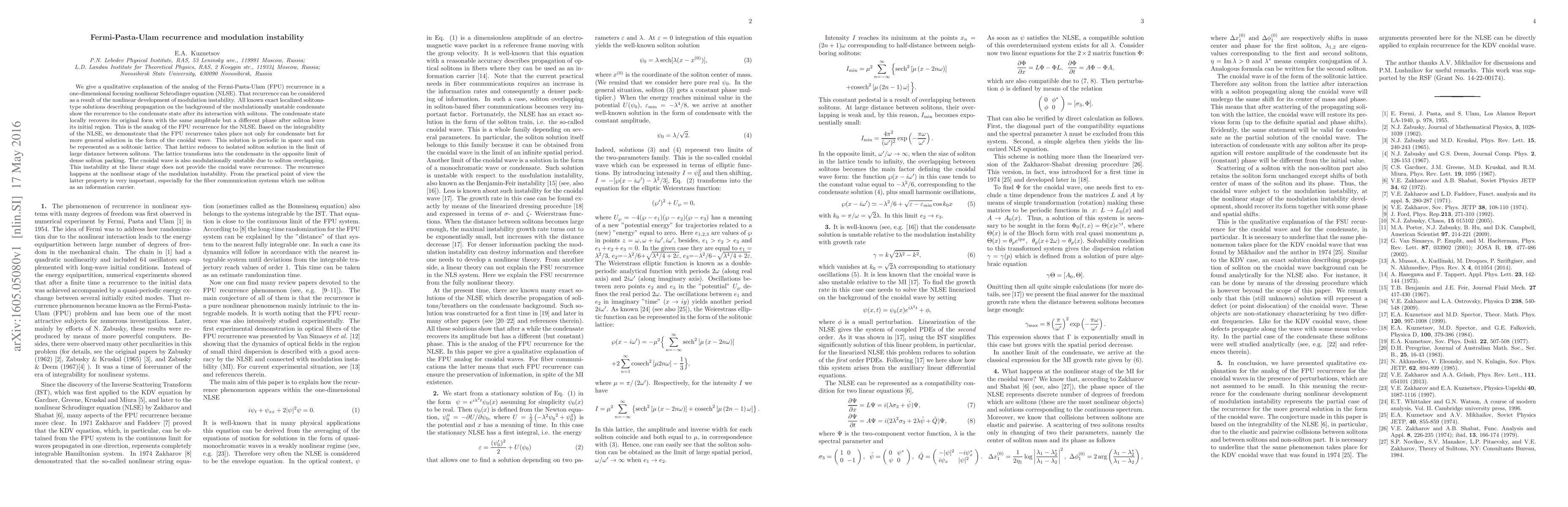 The paper explains the Fermi-Pasta-Ulam (FPU) recurrence in the context of a one-dimensional focusing nonlinear Schrödinger equation (NLSE), attributing it to the nonlinear development of modulation instability. The recurrence, observed in solitonic lattices and cnoidal waves, is crucial for soliton-based fiber communication systems.