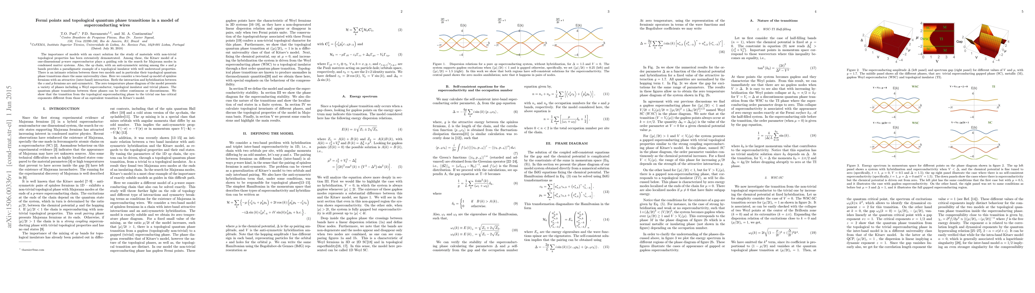 The importance of models with an exact solution for the study of materials with non-trivial topological properties has been extensively demonstrated. Among these, the Kitaev model of a one-dimensional $p$-wave superconductor plays a guiding role in the search for Majorana modes in condensed matter systems. Also, the $sp$ chain, with an anti-symmetric mixing among the $s$ and $p$ bands provides a paradigmatic example of a topological insulator with well understood properties. There is an intimate relation between these two models and in particular their topological quantum phase transitions share the same universality class. Here we consider a two-band $sp$ model of spinless fermions with an attractive (inter-band) interaction. Both the interaction and hybridization between the $s$ and $p$ fermions are anti-symmetric. The zero temperature phase diagram of the model presents a variety of phases including a Weyl superconductor, topological insulator and trivial phases. The quantum phase transitions between these phases can be either continuous or discontinuous. We show that the transition from the topological superconducting phase to the trivial one has critical exponents different from those of an equivalent transition in Kitaev's model.