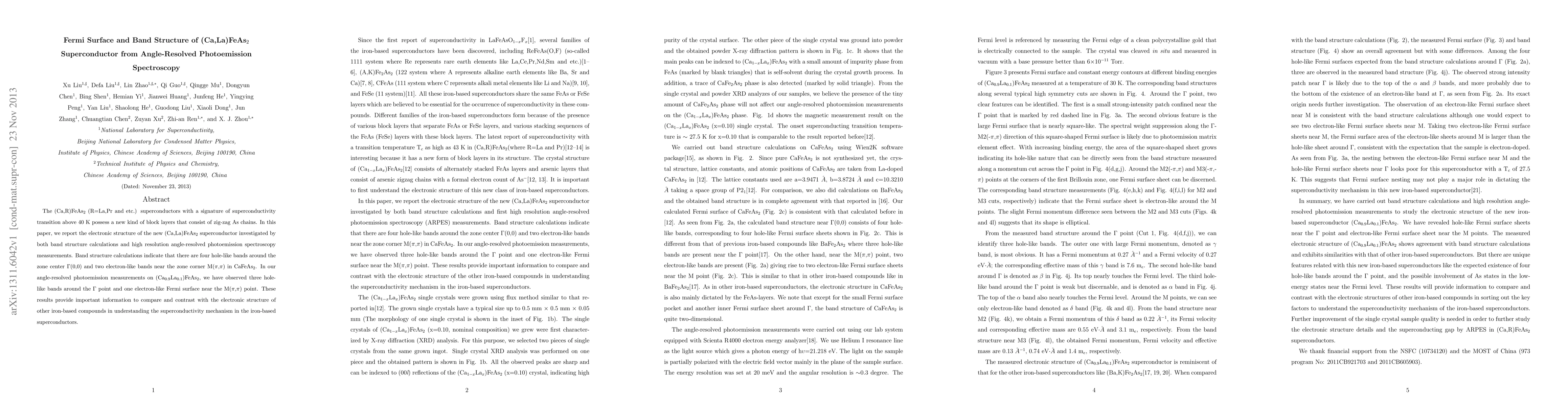 This study investigates the electronic structure of (Ca,La)FeAs2 superconductor using angle-resolved photoemission spectroscopy and band structure calculations, revealing four hole-like bands and two electron-like bands, which are crucial for understanding the superconductivity mechanism in iron-based superconductors.