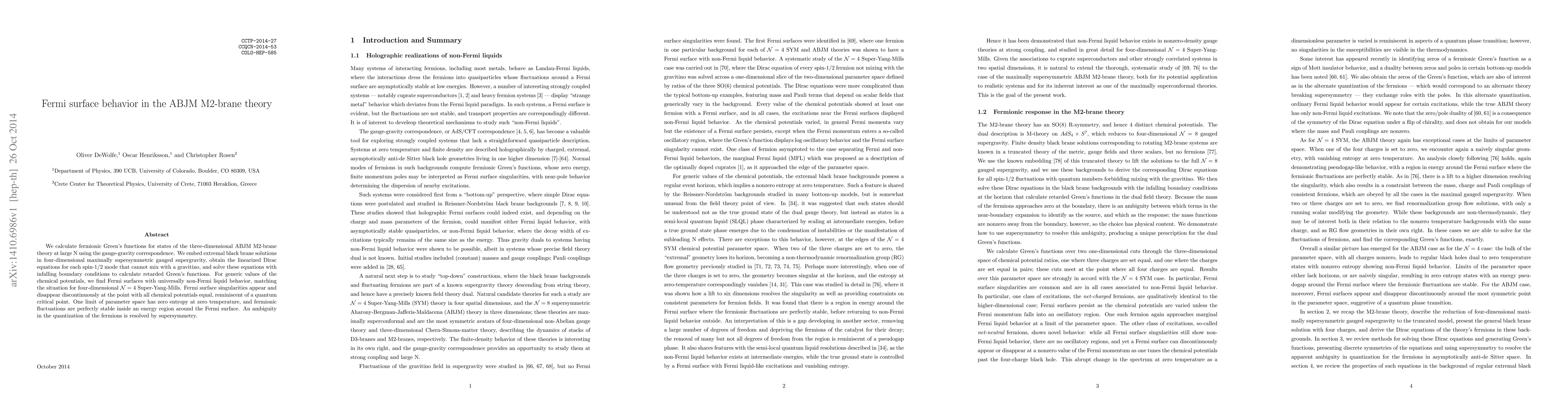 This paper investigates the Fermi surface behavior in the ABJM M2-brane theory using the gauge-gravity correspondence, revealing non-Fermi liquid behavior and discontinuous Fermi surface singularities akin to quantum critical points. The study resolves an ambiguity in fermion quantization through supersymmetry.
