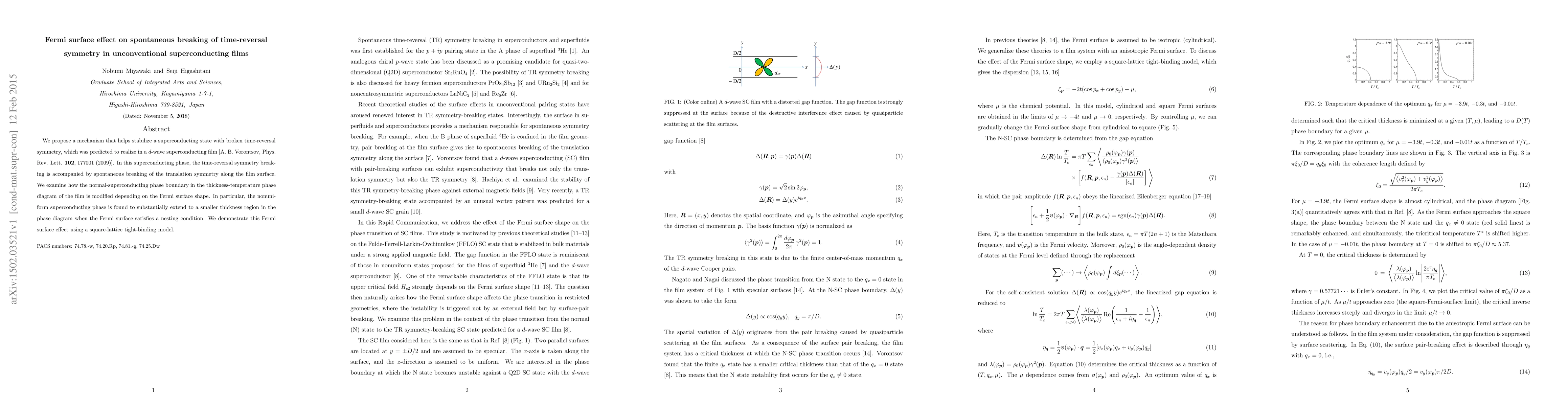 This paper proposes a mechanism for stabilizing a d-wave superconducting state with broken time-reversal symmetry in unconventional films, showing that the Fermi surface shape, especially under nesting conditions, significantly extends the nonuniform superconducting phase to thinner films. The effect is demonstrated using a square-lattice tight-binding model.