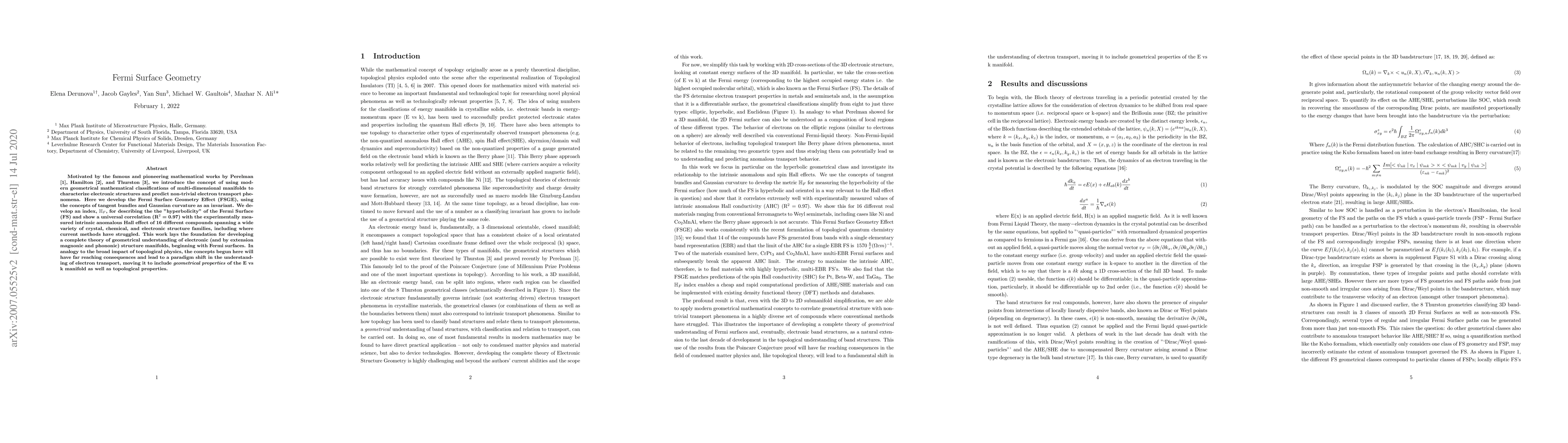 Motivated by the famous and pioneering mathematical works by Perelman, Hamilton, and Thurston, we introduce the concept of using modern geometrical mathematical classifications of multi-dimensional manifolds to characterize electronic structures and predict non-trivial electron transport phenomena. Here we develop the Fermi Surface Geometry Effect (FSGE), using the concepts of tangent bundles and Gaussian curvature as an invariant. We develop an index, $\mathbb{H}_F$, for describing the the "hyperbolicity" of the Fermi Surface (FS) and show a universal correlation (R$^2$ = 0.97) with the experimentally measured intrinsic anomalous Hall effect of 16 different compounds spanning a wide variety of crystal, chemical, and electronic structure families, including where current methods have struggled. This work lays the foundation for developing a complete theory of geometrical understanding of electronic (and by extension magnonic and phononic) structure manifolds, beginning with Fermi surfaces. In analogy to the broad impact of topological physics, the concepts begun here will have far reaching consequences and lead to a paradigm shift in the understanding of electron transport, moving it to include geometrical properties of the E vs k manifold as well as topological properties.