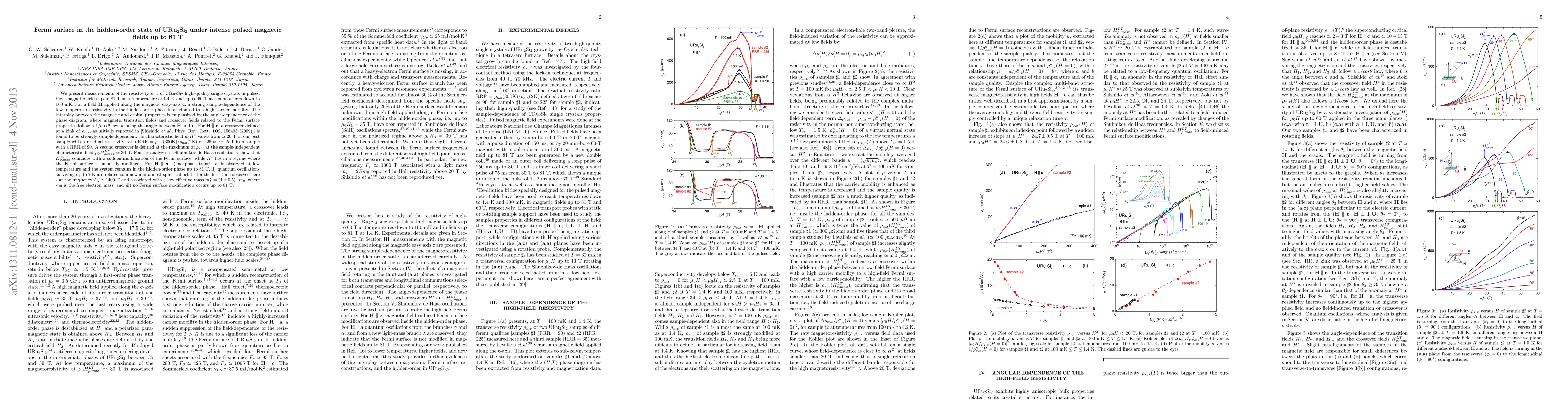 We present measurements of the resistivity $\rho_{x,x}$ of URu2Si2 high-quality single crystals in pulsed high magnetic fields up to 81~T at a temperature of 1.4~K and up to 60~T at temperatures down to 100~mK. For a field \textbf{H} applied along the magnetic easy-axis \textbf{c}, a strong sample-dependence of the low-temperature resistivity in the hidden-order phase is attributed to a high carrier mobility. The interplay between the magnetic and orbital properties is emphasized by the angle-dependence of the phase diagram, where magnetic transition fields and crossover fields related to the Fermi surface properties follow a 1/$\cos\theta$-law, $\theta$ being the angle between \textbf{H} and \textbf{c}. For $\mathbf{H}\parallel\mathbf{c}$, a crossover defined at a kink of $\rho_{x,x}$, as initially reported in [Shishido et al., Phys. Rev. Lett. \textbf{102}, 156403 (2009)], is found to be strongly sample-dependent: its characteristic field $\mu_0H^*$ varies from $\simeq20$~T in our best sample with a residual resistivity ratio RRR of $225$ to $\simeq25$~T in a sample with a RRR of $90$. A second crossover is defined at the maximum of $\rho_{x,x}$ at the sample-independent characteristic field $\mu_0H_{\rho,max}^{LT}\simeq30$~T. Fourier analyzes of SdH oscillations show that $H_{\rho,max}^{LT}$ coincides with a sudden modification of the Fermi surface, while $H^*$ lies in a regime where the Fermi surface is smoothly modified. For $\mathbf{H}\parallel\mathbf{a}$, i) no phase transition is observed at low temperature and the system remains in the hidden-order phase up to 81~T, ii) quantum oscillations surviving up to 7~K are related to a new and almost-spherical orbit - for the first time observed here - at the frequency $F_\lambda\simeq1400$~T and associated with a low effective mass $m^*_\lambda=(1\pm0.5)\cdot m_0$, and iii) no Fermi surface modification occurs up to 81~T.