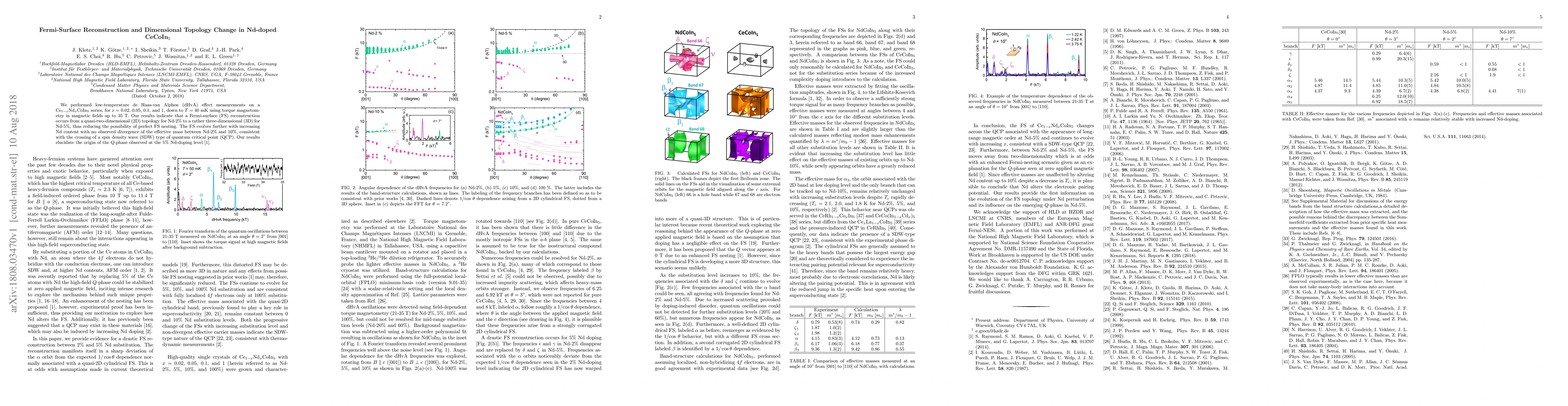 We performed low-temperature de Haas-van Alphen (dHvA) effect measurements on a Ce$_{1-x}$Nd$_x$CoIn$_5$ series, for x = 0.02, 0.05, 0.1, and 1, down to T = 40 mK using torque magnetometry in magnetic felds up to 35 T. Our results indicate that a Fermi-surface (FS) reconstruction occurs from a quasi-two-dimensional (2D) topology for Nd-2% to a rather three-dimensional (3D) for Nd-5%, thus reducing the possibility of perfect FS nesting. The FS evolves further with increasing Nd content with no observed divergence of the effective mass between Nd-2% and 10%, consistent with the crossing of a spin density wave (SDW) type of quantum critical point (QCP). Our results elucidate the origin of the Q-phase observed at the 5% Nd-doping level [Raymond et al., J. Phys. Soc. Jpn. 83, 013707 (2014)].
