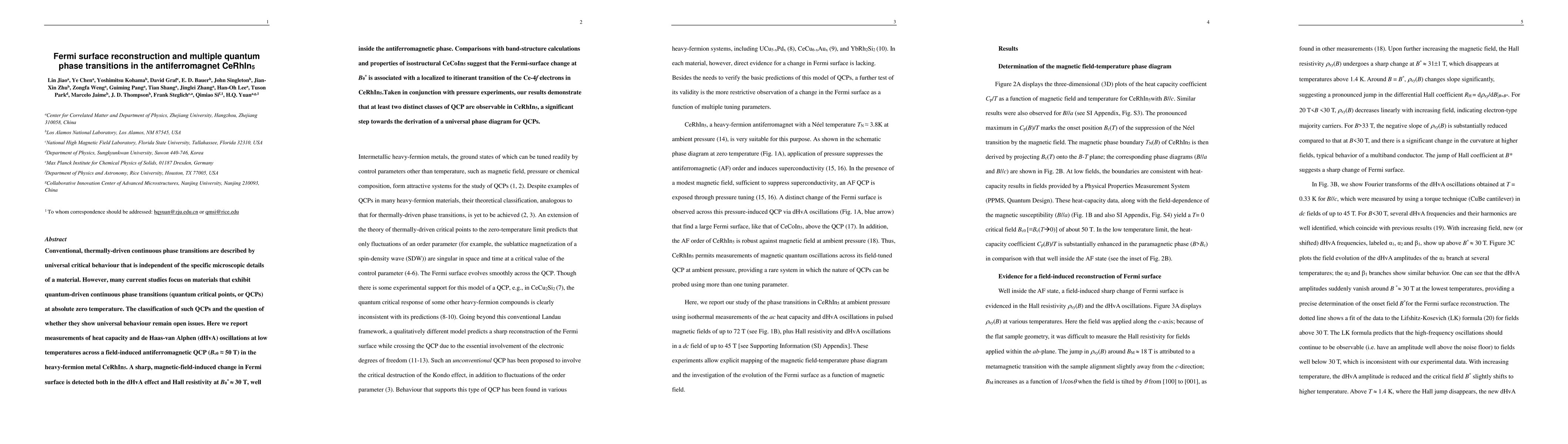 This study investigates the quantum phase transitions in the heavy-fermion antiferromagnet CeRhIn$_5$, revealing a sharp Fermi surface reconstruction at B$_0^*\simeq$ 30 T. The findings suggest multiple quantum critical points, advancing the understanding of universal behavior in quantum critical phenomena.