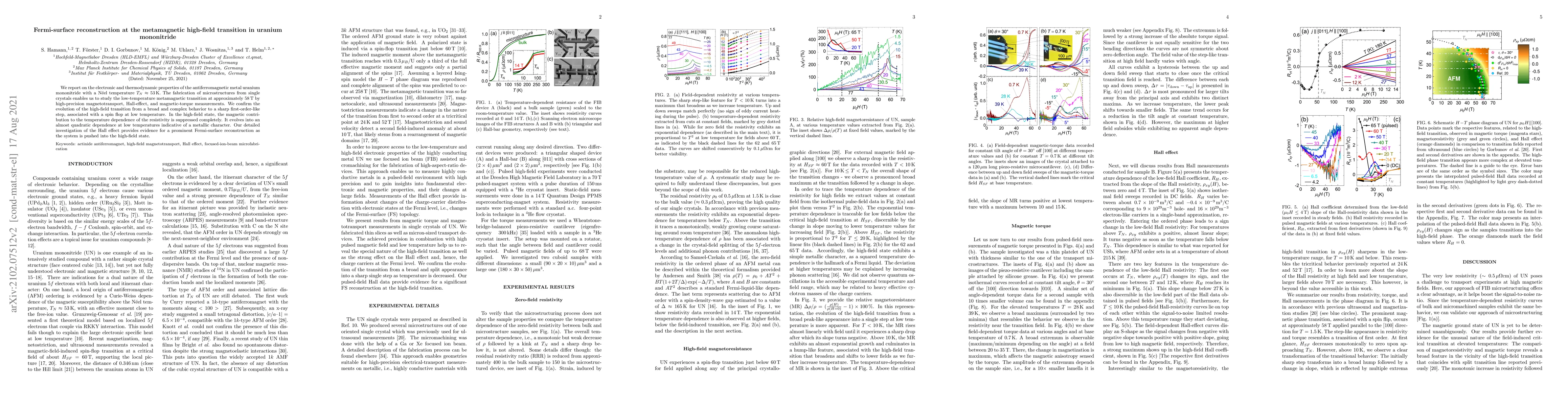 This study investigates the electronic and thermodynamic properties of uranium mononitride, revealing a metamagnetic high-field transition characterized by a Fermi-surface reconstruction. Detailed measurements show a transition from a broad to a sharp first-order-like step at low temperatures, accompanied by a metallic-like quadratic resistivity dependence.