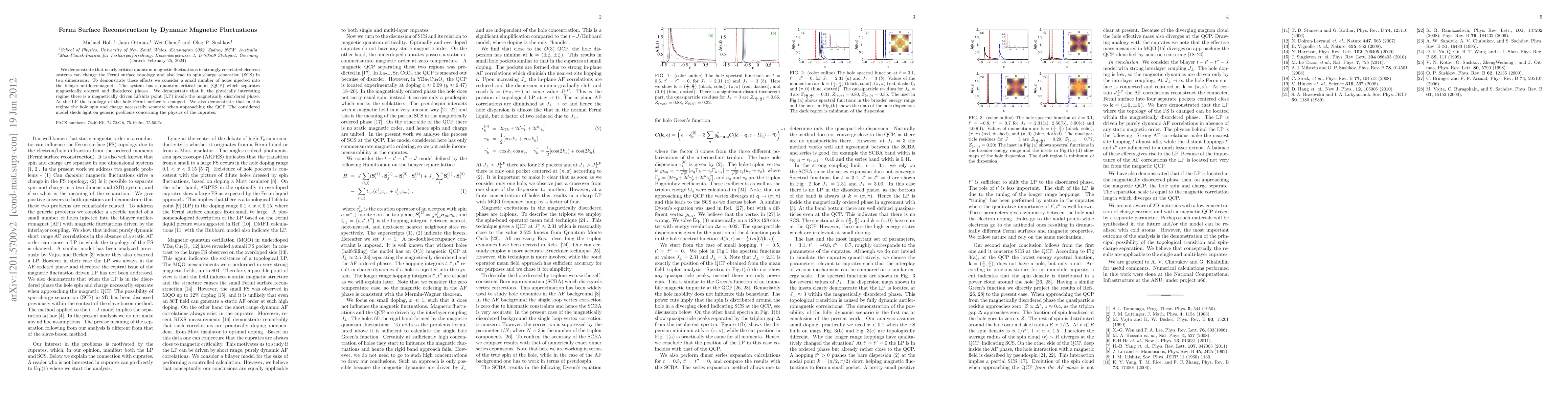 We demonstrate that nearly critical quantum magnetic fluctuations in strongly correlated electron systems can change the Fermi surface topology and also lead to spin charge separation (SCS) in two dimensions. To demonstrate these effects we consider a small number of holes injected into the bilayer antiferromagnet. The system has a quantum critical point (QCP) which separates magnetically ordered and disordered phases. We demonstrate that in the physically interesting regime there is a magnetically driven Lifshitz point (LP) inside the magnetically disordered phase. At the LP the topology of the hole Fermi surface is changed. We also demonstrate that in this regime the hole spin and charge necessarily separate when approaching the QCP. The considered model sheds light on generic problems concerning the physics of the cuprates.