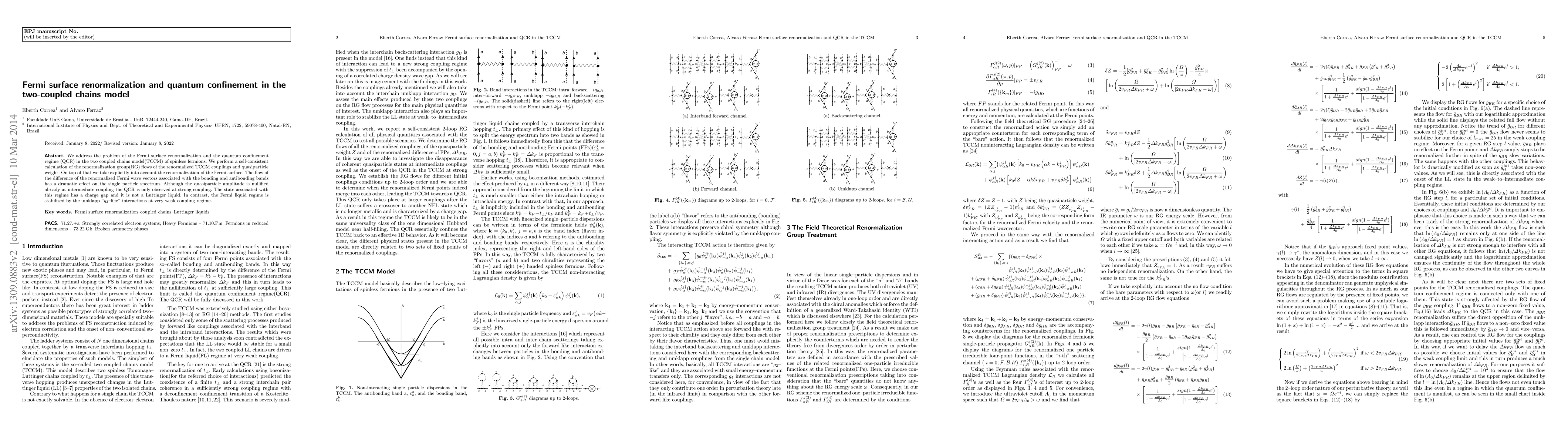 This paper investigates Fermi surface renormalization and quantum confinement in a two-coupled chains model (TCCM) of spinless fermions, revealing that the renormalization group flows significantly alter the single particle spectrum. The quantum confinement regime is observed only at strong coupling, characterized by a charge gap and non-Luttinger liquid behavior.