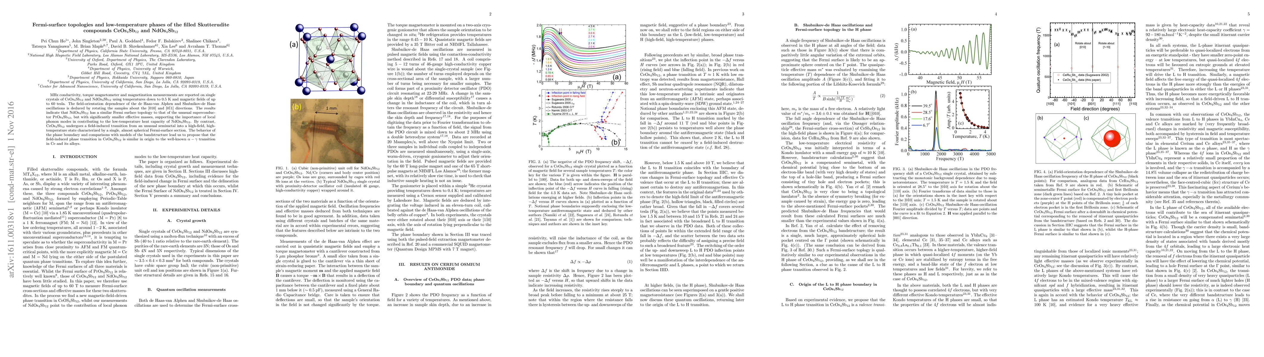 MHz conductivity, torque magnetometer and magnetization measurements are reported on single crystals of CeOs$_4$Sb$_{12}$ and NdOs$_4$Sb$_{12}$ using temperatures down to 0.5~K and magnetic fields of up to 60~tesla. The field-orientation dependence of the de Haas-van Alphen and Shubnikov-de Haas oscillations is deduced by rotating the samples about the $[010]$ and $[0\bar{1}1]$ directions. The results indicate that NdOs$_4$Sb$_{12}$ has a similar Fermi surface topology to that of the unusual superconductor PrOs$_4$Sb$_{12}$, but with significantly smaller effective masses, supporting the importance of local phonon modes in contributing to the low-temperature heat capacity of NdOs$_4$Sb$_{12}$. By contrast, CeOs$_4$Sb$_{12}$ undergoes a field-induced transition from an unusual semimetal into a high-field, high-temperature state characterized by a single, almost spherical Fermi-surface section. The behavior of the phase boundary and comparisons with models of the bandstructure lead us to propose that the field-induced phase transition in CeOs$_4$Sb$_{12}$ is similar in origin to the well-known $\alpha-\gamma$ transition in Ce and its alloys.