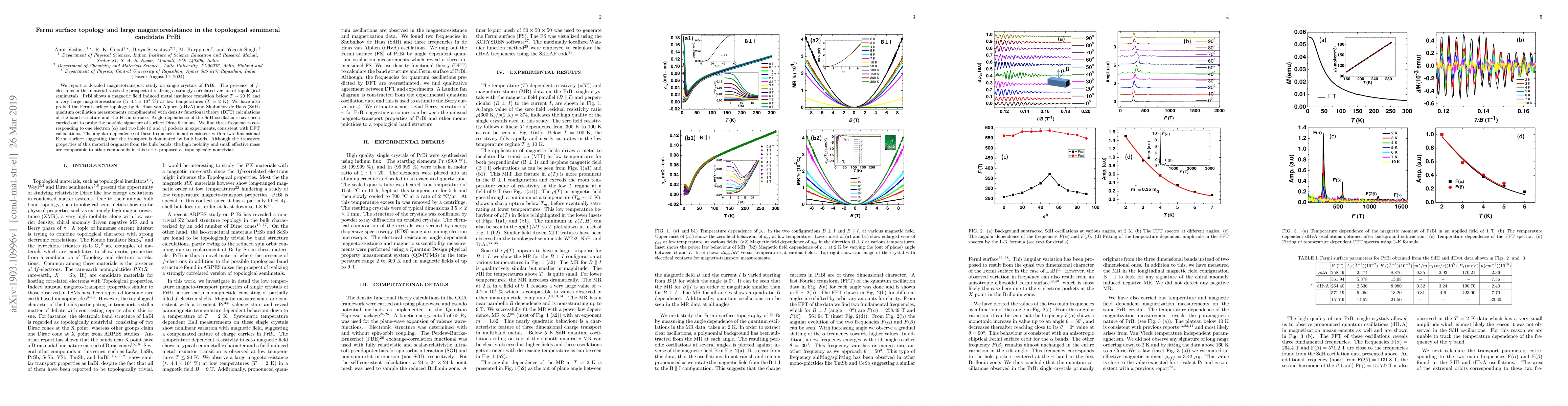 We report a detailed magnetotransport study on single crystals of PrBi. The presence of $f$-electrons in this material raises the prospect of realizing a strongly correlated version of topological semimetals. PrBi shows a magnetic field induced metal insulator transition below $T \sim 20$ K and a very large magnetoresistance ($\approx 4.4 \times 10^4~$) at low temperatures ($T= 2$ K). We have also probed the Fermi surface topology by de Haas van Alphen (dHvA) and Shubnikov de Haas (SdH) quantum oscillation measurements complimented with density functional theory (DFT) calculations of the band structure and the Fermi surface. Angle dependence of the SdH oscillations have been carried out to probe the possible signature of surface Dirac fermions. We find three frequencies corresponding to one electron ($\alpha$) and two hole ($\beta$ and $\gamma$) pockets in experiments, consistent with DFT calculations. The angular dependence of these frequencies is not consistent with a two dimensional Fermi surface suggesting that the transport is dominated by bulk bands. Although the transport properties of this material originate from the bulk bands, the high mobility and small effective mass are comparable to other compounds in this series proposed as topologically nontrivial.