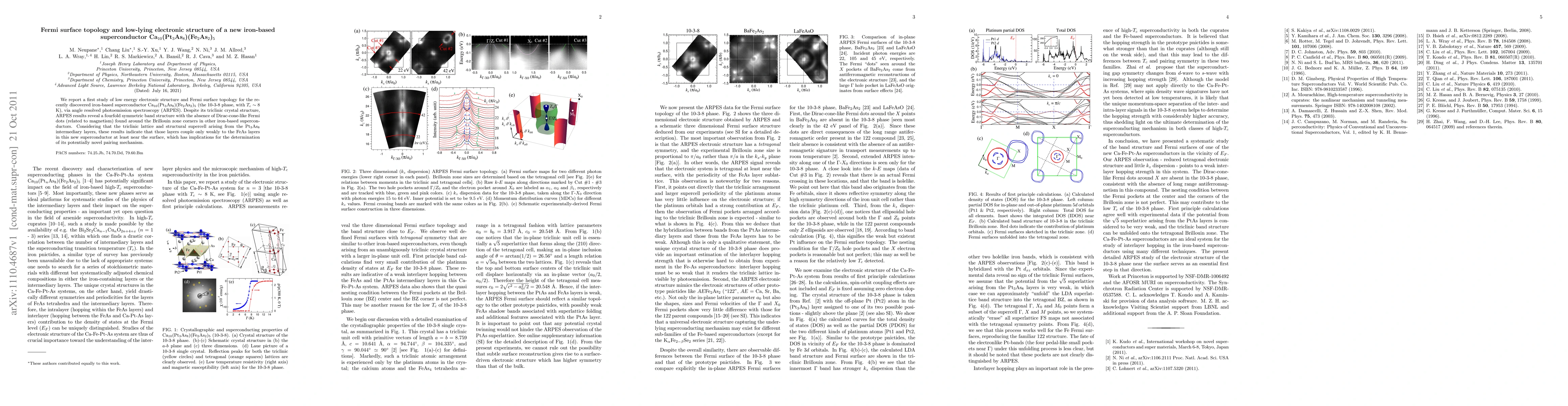 We report a first study of low energy electronic structure and Fermi surface topology for the recently discovered iron-based superconductor Ca10(Pt3As8)(Fe2As2)5 (the 10-3-8 phase, with Tc = 8K), via angle-resolved photoemission spectroscopy (ARPES). Despite its triclinic crystal structure, ARPES results reveal a fourfold symmetric band structure with the absence of Dirac-cone-like Fermi dots (related to magnetism) found around the Brillouin zone corners in other iron-based superconductors. Considering that the triclinic lattice and structural supercell arising from the Pt3As8 intermediary layers, these results indicate that those layers couple only weakly to the FeAs layers in this new superconductor, which has implications for the determination of its potentially novel pairing mechanism.