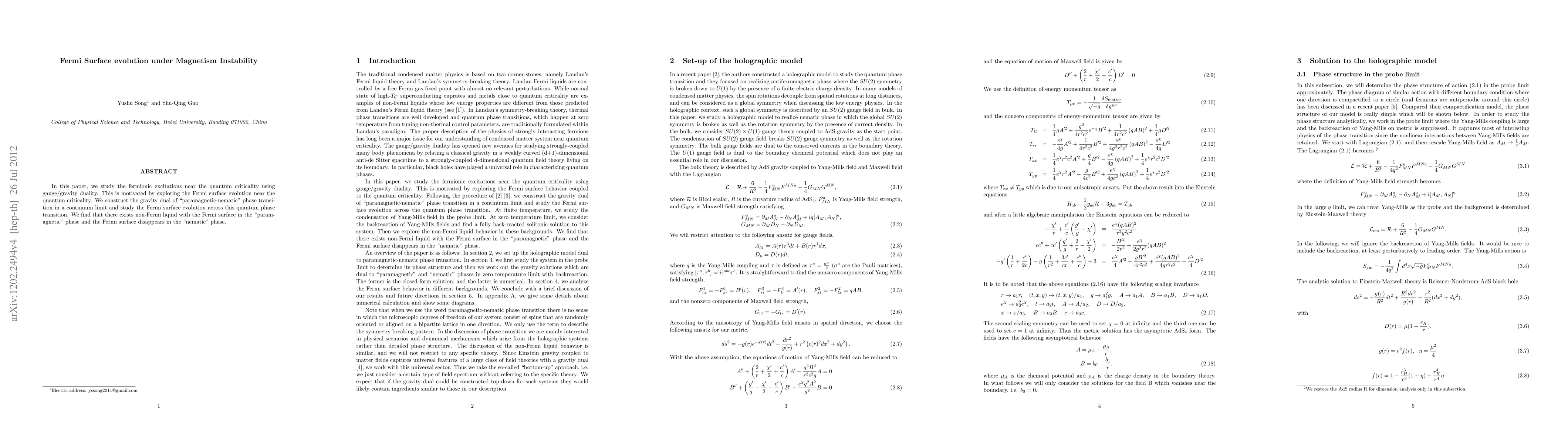 In this paper, we study the fermionic excitations near the quantum criticality using gauge/gravity duality. This is motivated by exploring the Fermi surface evolution near the quantum criticality. We construct the gravity dual of "paramagnetic-nematic" phase transition in a continuum limit and study the Fermi surface evolution across this quantum phase transition. We find that there exists non-Fermi liquid with the Fermi surface in the "paramagnetic" phase and the Fermi surface disappears in the "nematic" phase.