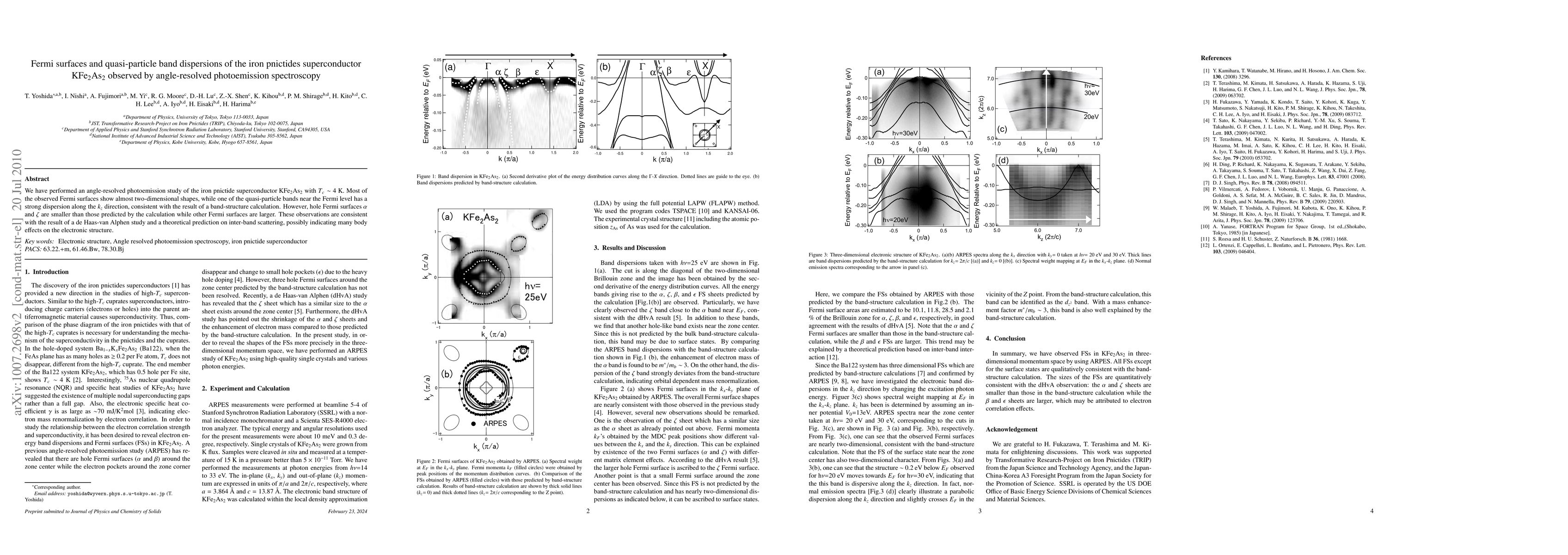 This study uses angle-resolved photoemission spectroscopy to analyze the Fermi surfaces and quasi-particle band dispersions in the iron pnictide superconductor KFe2As2. Most Fermi surfaces exhibit two-dimensional shapes, but discrepancies between observed and calculated Fermi surface sizes suggest significant many-body effects.