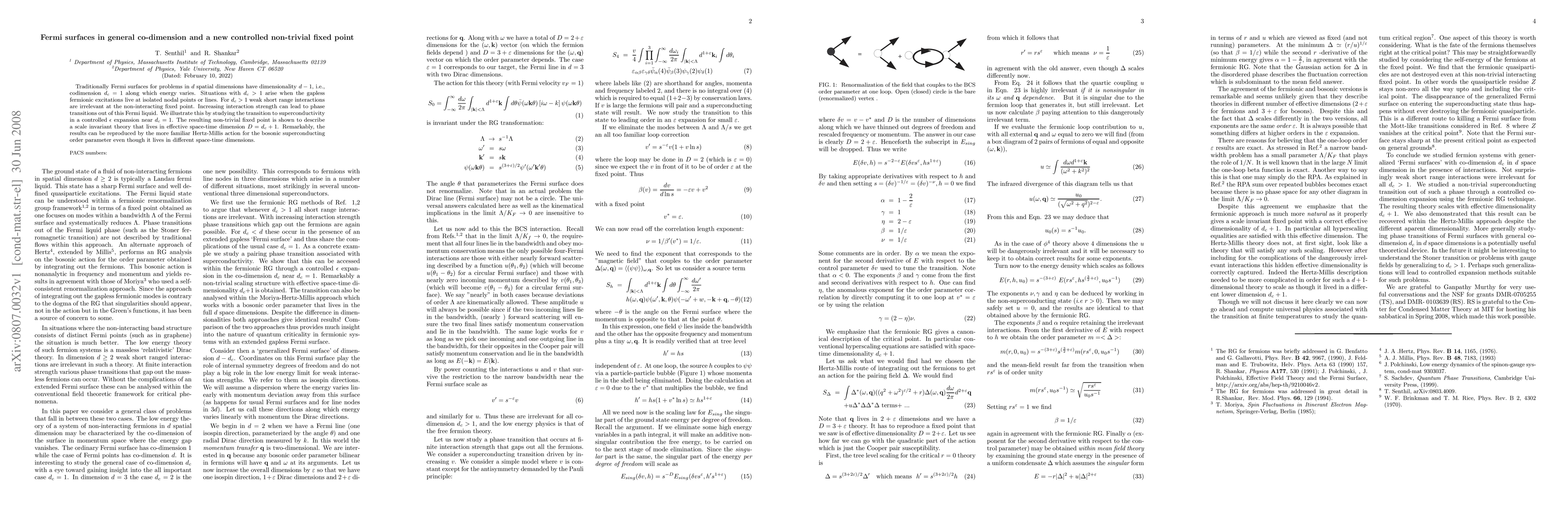 Traditionally Fermi surfaces for problems in $d$ spatial dimensions have dimensionality $d-1$, i.e., codimension $d_c=1$ along which energy varies. Situations with $d_c >1$ arise when the gapless fermionic excitations live at isolated nodal points or lines. For $d_c > 1$ weak short range interactions are irrelevant at the non-interacting fixed point. Increasing interaction strength can lead to phase transitions out of this Fermi liquid. We illustrate this by studying the transition to superconductivity in a controlled $\epsilon$ expansion near $d_c = 1$. The resulting non-trivial fixed point is shown to describe a scale invariant theory that lives in effective space-time dimension $D=d_c + 1$. Remarkably, the results can be reproduced by the more familiar Hertz-Millis action for the bosonic superconducting order parameter even though it lives in different space-time dimensions.