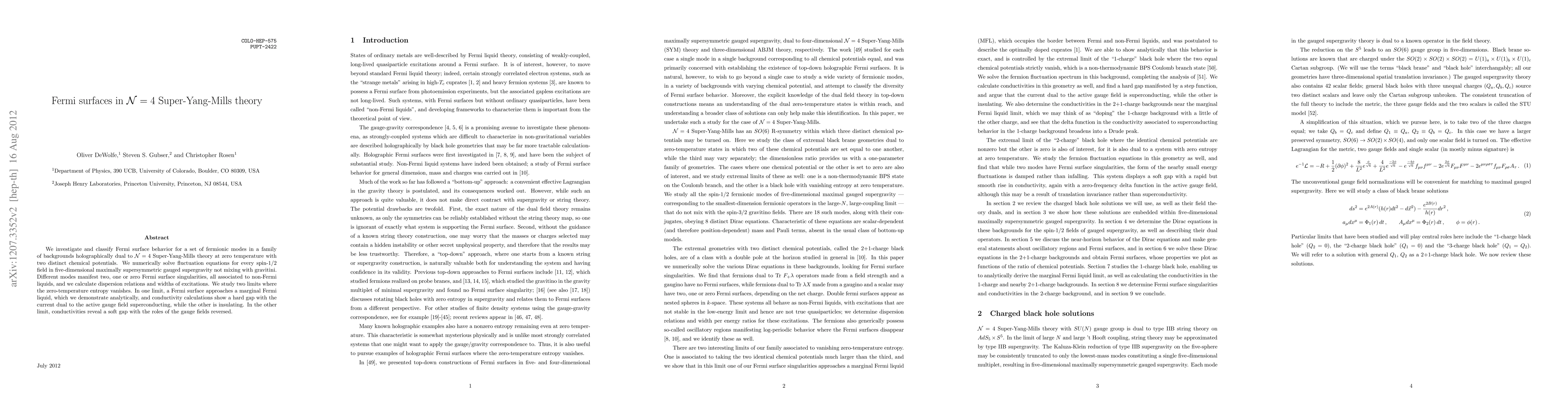 We investigate and classify Fermi surface behavior for a set of fermionic modes in a family of backgrounds holographically dual to N=4 Super-Yang-Mills theory at zero temperature with two distinct chemical potentials. We numerically solve fluctuation equations for every spin-1/2 field in five-dimensional maximally supersymmetric gauged supergravity not mixing with gravitini. Different modes manifest two, one or zero Fermi surface singularities, all associated to non-Fermi liquids, and we calculate dispersion relations and widths of excitations. We study two limits where the zero-temperature entropy vanishes. In one limit, a Fermi surface approaches a marginal Fermi liquid, which we demonstrate analytically, and conductivity calculations show a hard gap with the current dual to the active gauge field superconducting, while the other is insulating. In the other limit, conductivities reveal a soft gap with the roles of the gauge fields reversed.