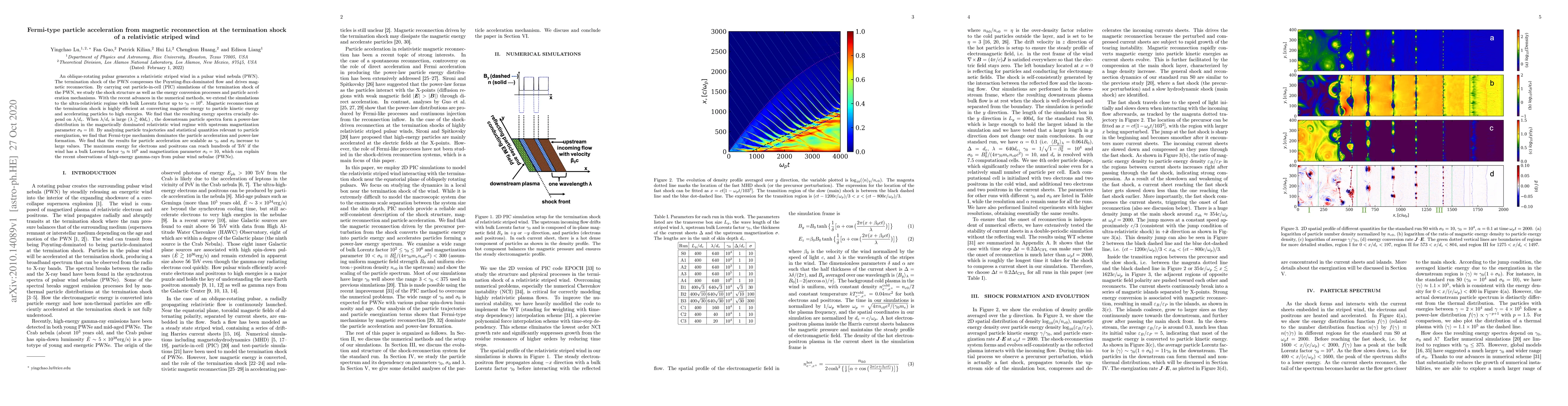 An oblique-rotating pulsar generates a relativistic striped wind in a pulsar wind nebula (PWN). The termination shock of the PWN compresses the Poynting-flux-dominated flow and drives magnetic reconnection. By carrying out particle-in-cell (PIC) simulations of the termination shock of the PWN, we study the shock structure as well as the energy conversion processes and particle acceleration mechanisms. With the recent advances in the numerical methods, we extend the simulations to the ultra-relativistic regime with bulk Lorentz factor up to \gamma_{0}=10^{6}. Magnetic reconnection at the termination shock is highly efficient at converting magnetic energy to particle kinetic energy and accelerating particles to high energies. We find that the resulting energy spectra crucially depend on \lambda/d_{e}. When \lambda/d_{e} is large (\lambda\gtrsim40d_{e}) , the downstream particle spectra form a power-law distribution in the magnetically dominated relativistic wind regime with upstream magnetization parameter \sigma_{0}=10. By analyzing particle trajectories and statistical quantities relevant to particle energization, we find that Fermi-type mechanism dominates the particle acceleration and power-law formation. We find that the results for particle acceleration are scalable as \gamma_{0} and \sigma_{0} increase to large values. The maximum energy for electrons and positrons can reach hundreds of TeV if the wind has a bulk Lorentz factor \gamma_{0}\approx10^{6} and magnetization parameter \sigma_{0}=10, which can explain the recent observations of high-energy gamma-rays from pulsar wind nebulae (PWNe).
