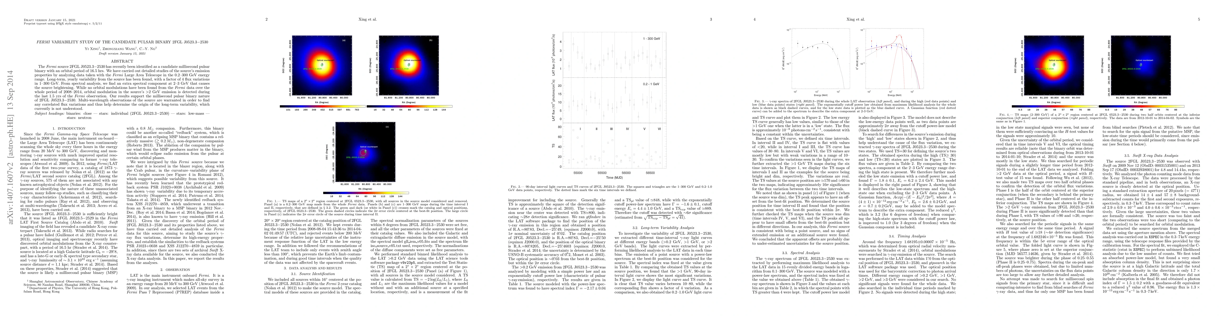 The Fermi source 2FGL~J0523.3$-$2530 has recently been identified as a candidate millisecond pulsar binary with an orbital period of 16.5 hrs. We have carried out detailed studies of the source's emission properties by analyzing data taken with the Fermi Large Area Telescope in the 0.2--300 GeV energy range. Long-term, yearly variability from the source has been found, with a factor of 4 flux variations in 1--300 GeV. From spectral analysis, we find an extra spectral component at 2--3 GeV that causes the source brightening. While no orbital modulations have been found from the Fermi data over the whole period of 2008--2014, orbital modulation in the source's $>$2 GeV emission is detected during the last 1.5 yrs of the Fermi observation. Our results support the millisecond pulsar binary nature of 2FGL~J0523.3$-$2530. Multi-wavelength observations of the source are warranted in order to find any correlated flux variations and thus help determine the origin of the long-term variability, which currently is not understood.