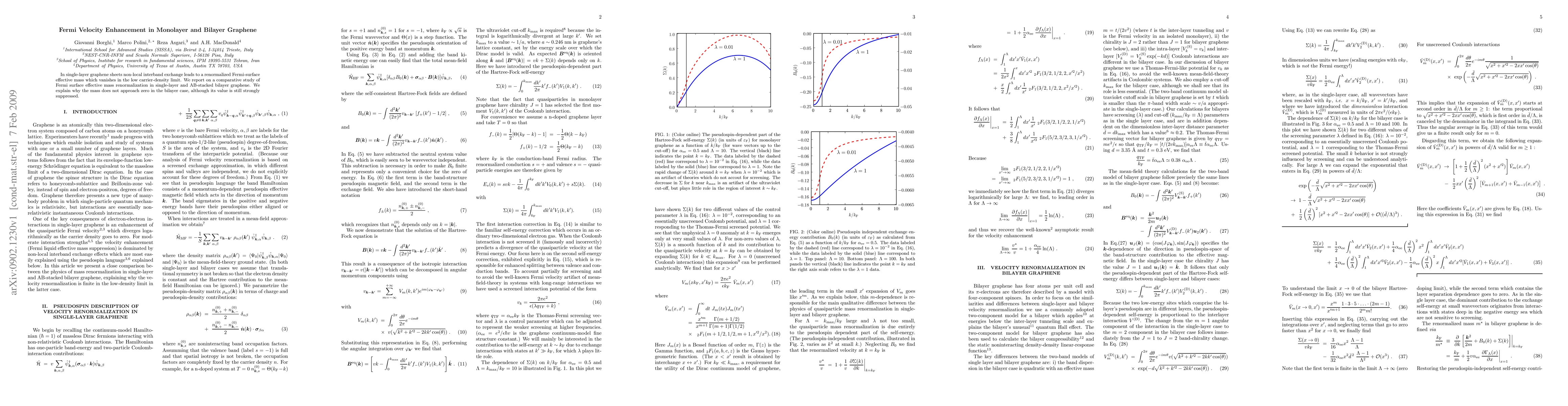 In single-layer graphene sheets non-local interband exchange leads to a renormalized Fermi-surface effective mass which vanishes in the low carrier-density limit. We report on a comparative study of Fermi surface effective mass renormalization in single-layer and AB-stacked bilayer graphene. We explain why the mass does not approach zero in the bilayer case, although its value is still strongly suppressed.