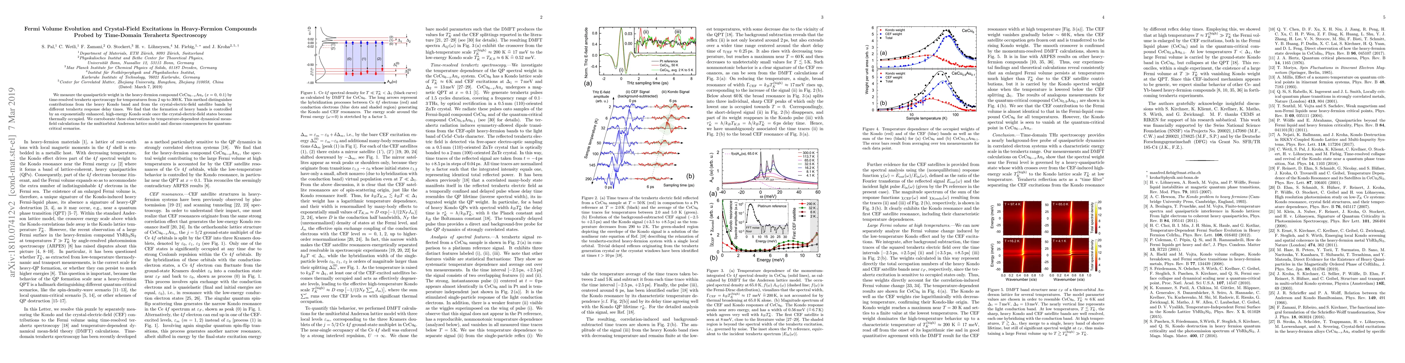 This paper uses time-domain terahertz spectroscopy to measure quasiparticle weight in heavy-fermion compounds CeCu$_{6-x}$Au$_{x}$, revealing that heavy band formation is influenced by an exponentially enhanced Kondo scale when crystal-electric-field states are thermally occupied, supported by dynamical mean-field calculations.
