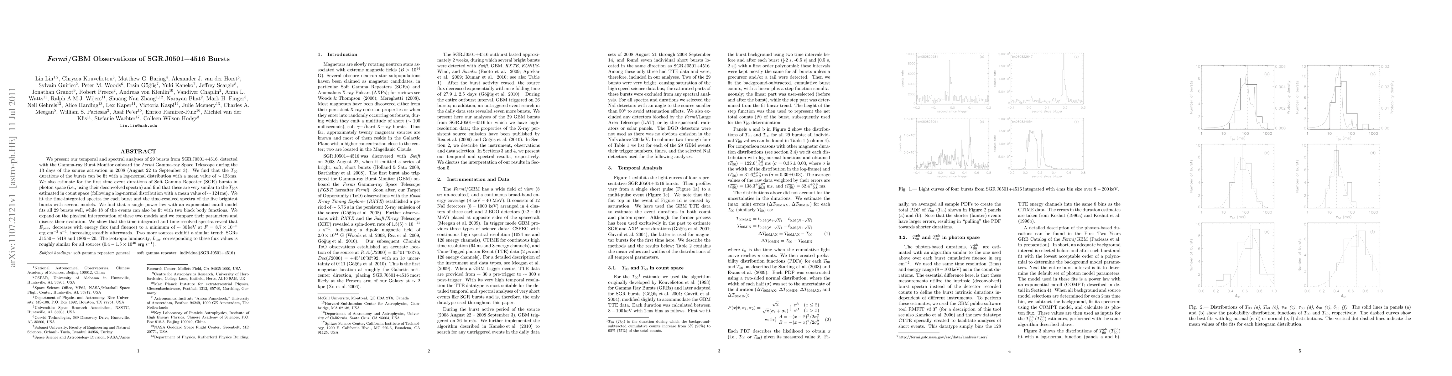 We present our temporal and spectral analyses of 29 bursts from SGR J0501+4516, detected with the Gamma-ray Burst Monitor onboard the Fermi Gamma-ray Space Telescope during the 13 days of the source activation in 2008 (August 22 to September 3). We find that the T90 durations of the bursts can be fit with a log-normal distribution with a mean value of ~ 123 ms. We also estimate for the first time event durations of Soft Gamma Repeater (SGR) bursts in photon space (i.e., using their deconvolved spectra) and find that these are very similar to the T90s estimated in count space (following a log-normal distribution with a mean value of ~ 124 ms). We fit the time-integrated spectra for each burst and the time-resolved spectra of the five brightest bursts with several models. We find that a single power law with an exponential cutoff model fits all 29 bursts well, while 18 of the events can also be fit with two black body functions. We expand on the physical interpretation of these two models and we compare their parameters and discuss their evolution. We show that the time-integrated and time-resolved spectra reveal that Epeak decreases with energy flux (and fluence) to a minimum of ~30 keV at F=8.7e-6 erg/cm2/s, increasing steadily afterwards. Two more sources exhibit a similar trend: SGRs J1550-5418 and 1806-20. The isotropic luminosity corresponding to these flux values is roughly similar for all sources (0.4-1.5 e40 erg/s).