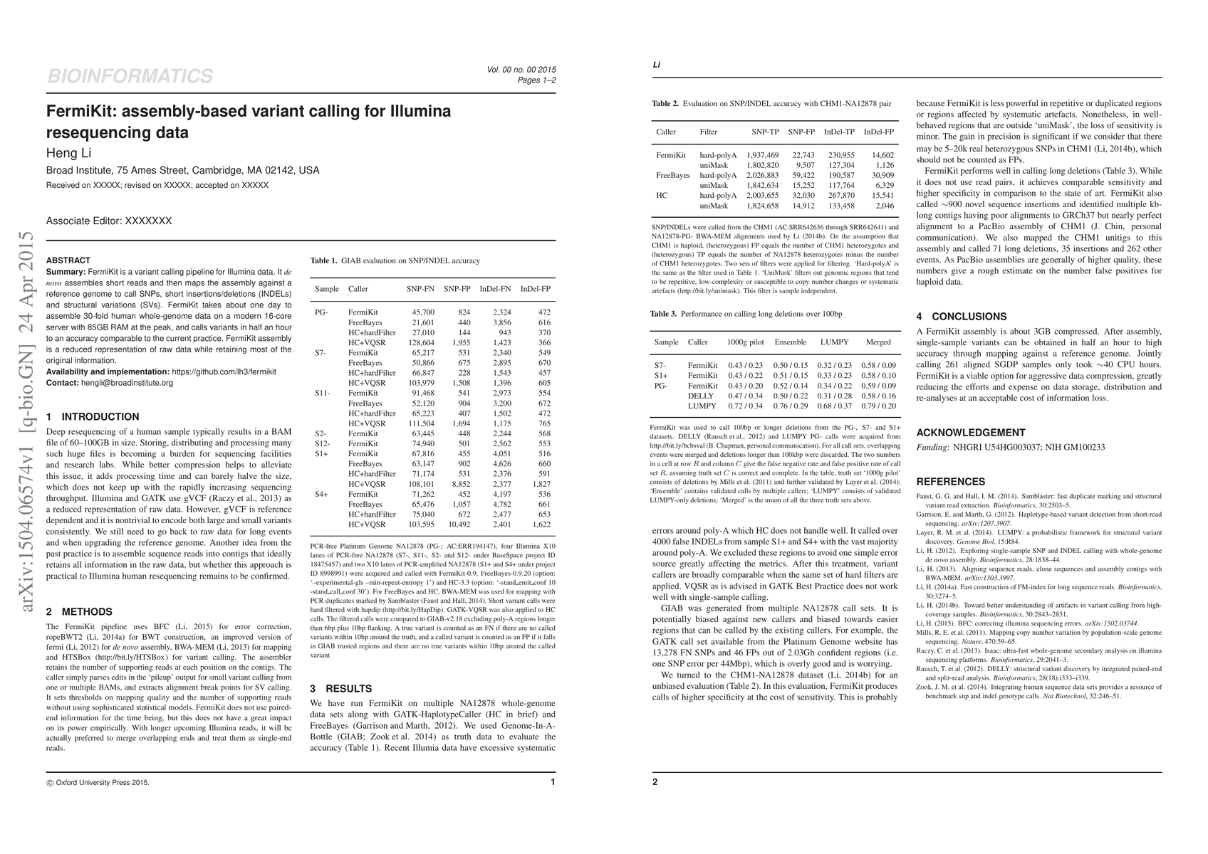 Summary: FermiKit is a variant calling pipeline for Illumina data. It de novo assembles short reads and then maps the assembly against a reference genome to call SNPs, short insertions/deletions (INDELs) and structural variations (SVs). FermiKit takes about one day to assemble 30-fold human whole-genome data on a modern 16-core server with 85GB RAM at the peak, and calls variants in half an hour to an accuracy comparable to the current practice. FermiKit assembly is a reduced representation of raw data while retaining most of the original information. Availability and implementation: https://github.com/lh3/fermikit Contact: [email protected]