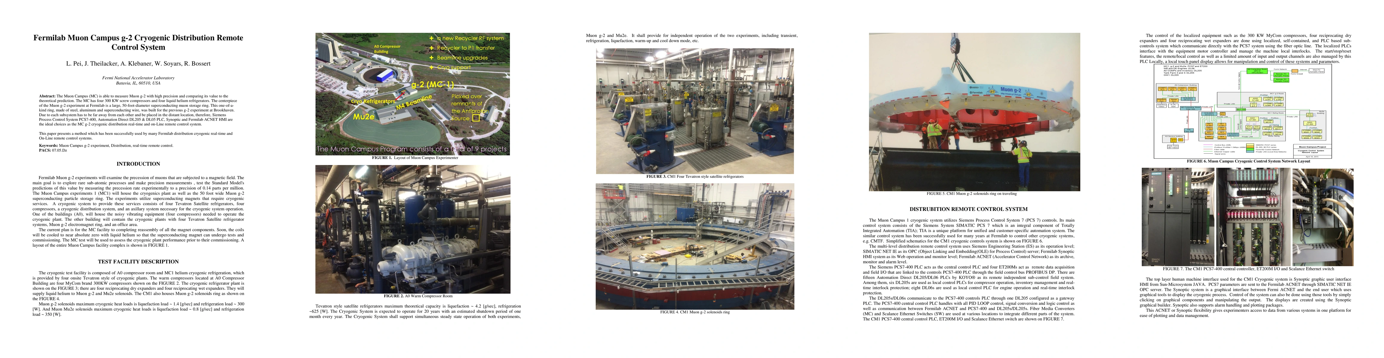 The Muon Campus (MC) is able to measure Muon g-2 with high precision and comparing its value to the theoretical prediction. The MC has four 300 KW screw compressors and four liquid helium refrigerators. The centerpiece of the Muon g-2 experiment at Fermilab is a large, 50-foot-diameter superconducting muon storage ring. This one-of-a-kind ring, made of steel, aluminum and superconducting wire, was built for the previous g-2 experiment at Brookhaven. Due to each subsystem has to be far away from each other and be placed in the distant location, therefore, Siemens Process Control System PCS7-400, Automation Direct DL205 & DL05 PLC, Synoptic and Fermilab ACNET HMI are the ideal choices as the MC g-2 cryogenic distribution real-time and on-Line remote control system. This paper presents a method which has been successfully used by many Fermilab distribution cryogenic real-time and On-Line remote control systems.