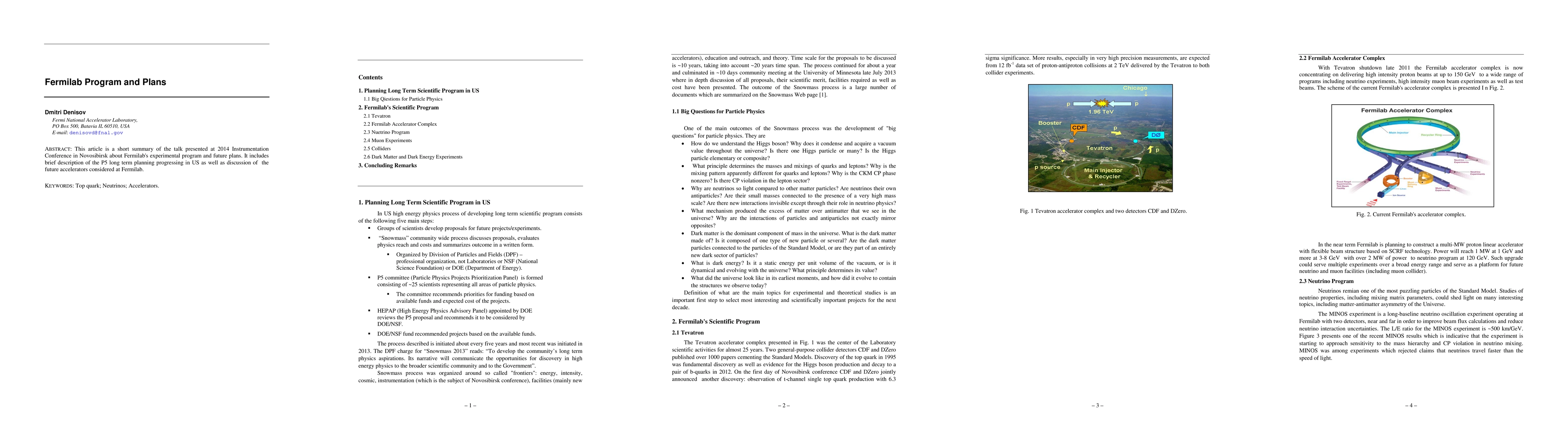 This article is a short summary of the talk presented at 2014 Instrumentation Conference in Novosibirsk about Fermilab's experimental program and future plans. It includes brief description of the P5 long term planning progressing in US as well as discussion of the future accelerators considered at Fermilab.