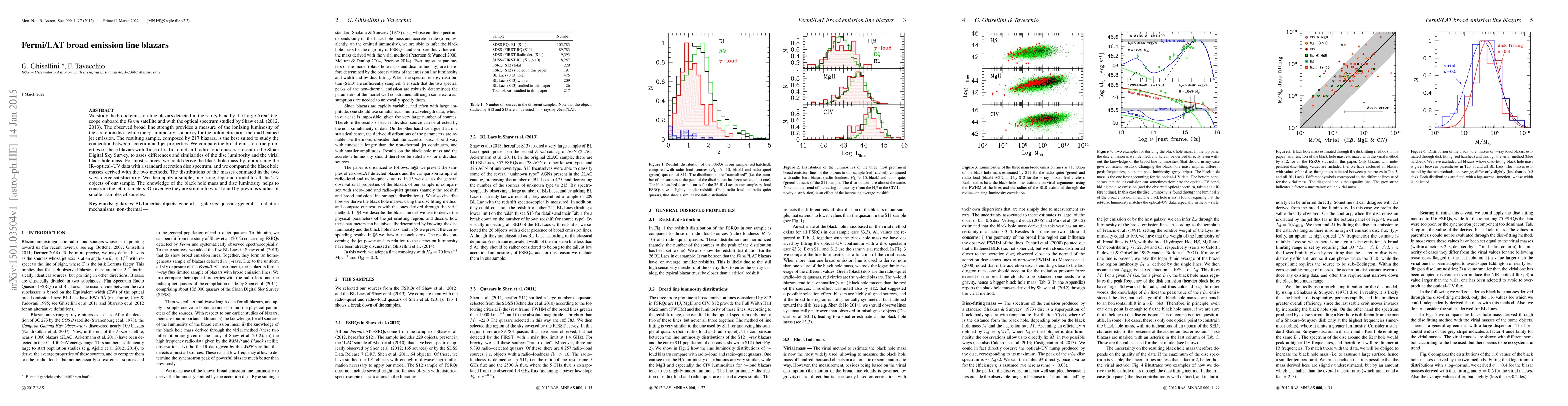 We study the broad emission line blazars detected in the gamma-ray band by the Large Area Telescope onboard the Fermi satellite and with the optical spectrum studied by Shaw et al. (2012, 2013). The observed broad line strength provides a measure of the ionizing luminosity of the accretion disk, while the gamma-luminosity is a proxy for the bolometric non-thermal beamed jet emission. The resulting sample, composed by 217 blazars, is the best suited to study the connection between accretion and jet properties. We compare the broad emission line properties of these blazars with those of radio-quiet and radio-loud quasars present in the Sloan Digital Sky Survey, to asses differences and similarities of the disc luminosity and the virial black hole mass. For most sources, we could derive the black hole mass by reproducing the IR-optical-UV data with a standard accretion disc spectrum, and we compared the black hole masses derived with the two methods. The distributions of the masses estimated in the two ways agree satisfactorily. We then apply a simple, one-zone, leptonic model to all the 217 objects of our sample. The knowledge of the black hole mass and disc luminosity helps to constrain the jet parameters. On average they are similar to what found by previous studies of smaller samples of sources.