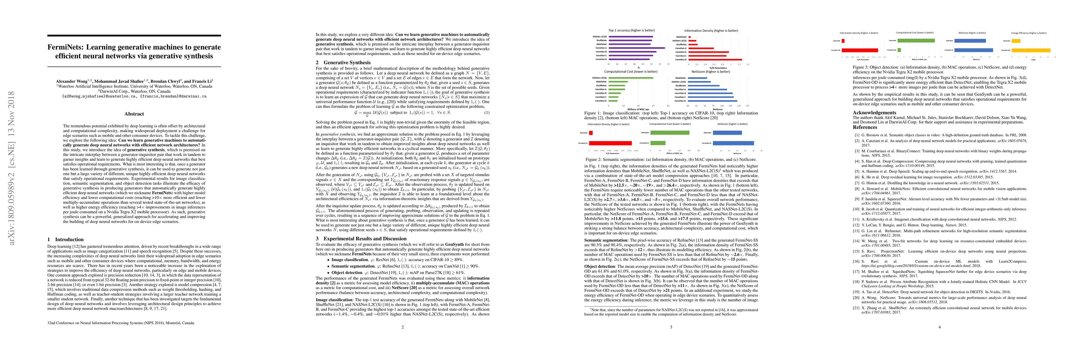 This paper introduces generative synthesis to automatically generate highly efficient neural networks, termed FermiNets, for edge devices. The method employs a generator-inquisitor pair to create diverse, efficient networks with lower computational costs and higher energy efficiency, achieving up to 10x efficiency improvements over state-of-the-art networks.