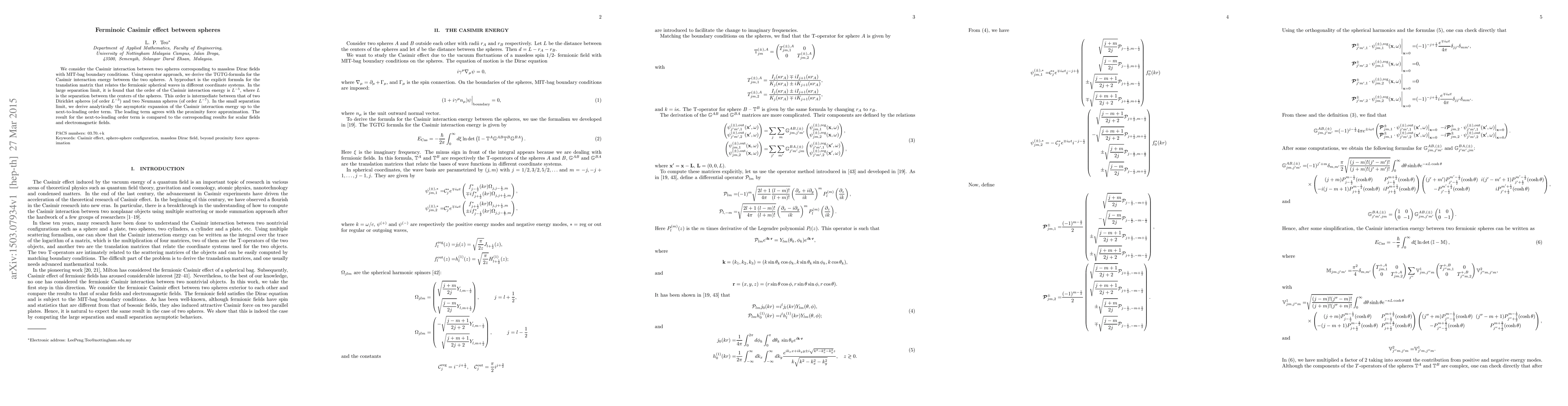 This paper derives the Casimir interaction energy between two spheres for massless Dirac fields with MIT-bag boundary conditions, finding an intermediate $L^{-5}$ decay with separation $L$. It also provides an asymptotic expansion for small separations and compares next-to-leading order terms with scalar and electromagnetic fields.
