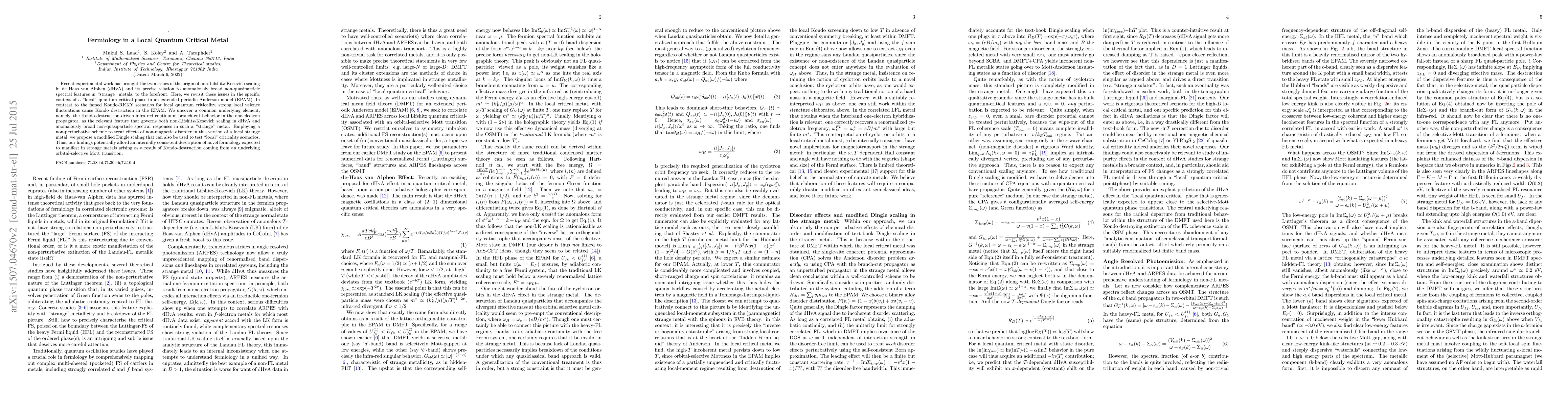 The paper explores a local quantum critical phase in an extended periodic Anderson model, identifying a common cause for unusual dHvA scaling and broad spectral features in 'strange' metals. It proposes a modified Dingle scaling to test these scenarios, suggesting an internally consistent description of fermiology stemming from Kondo-destruction in orbital-selective Mott transitions.