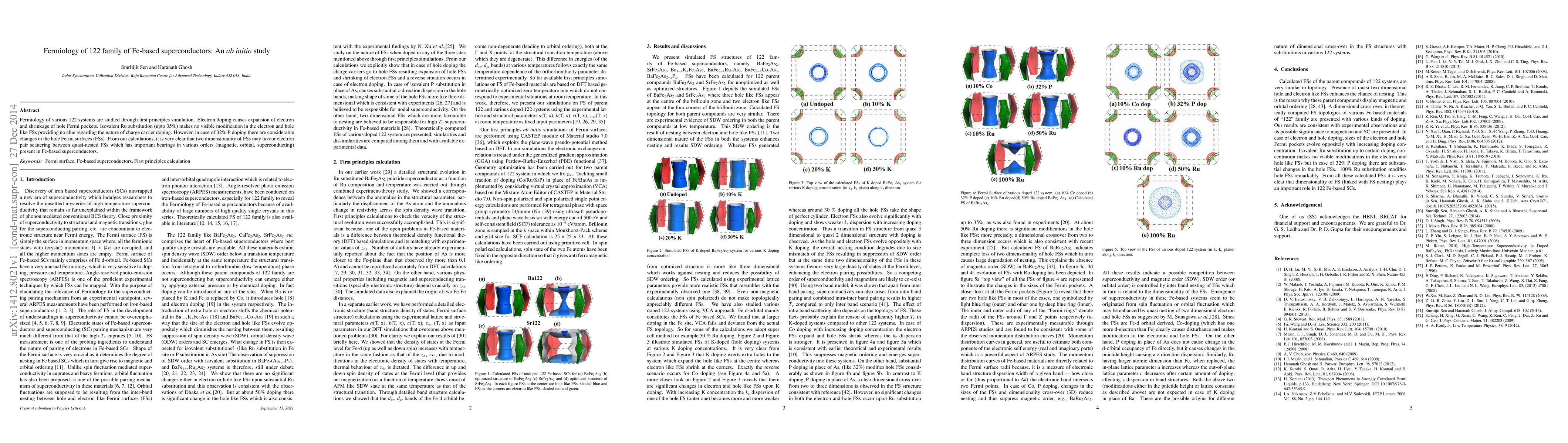 Fermiology of various 122 systems are studied through first principles simulation. Electron doping causes expansion of electron and shrinkage of hole Fermi pockets. Isovalent Ru substitution (upto 35%) makes no visible modification in the electron and hole like FSs providing no clue regarding the nature of charge carrier doping. However, in case of 32% P doping there are considerable changes in the hole Fermi surfaces (FSs). From our calculations, it is very clear that two dimensionality of FSs may favour electron pair scattering between quasi-nested FSs which has important bearings in various orders (magnetic, orbital, superconducting) present in Fe-based superconductors.