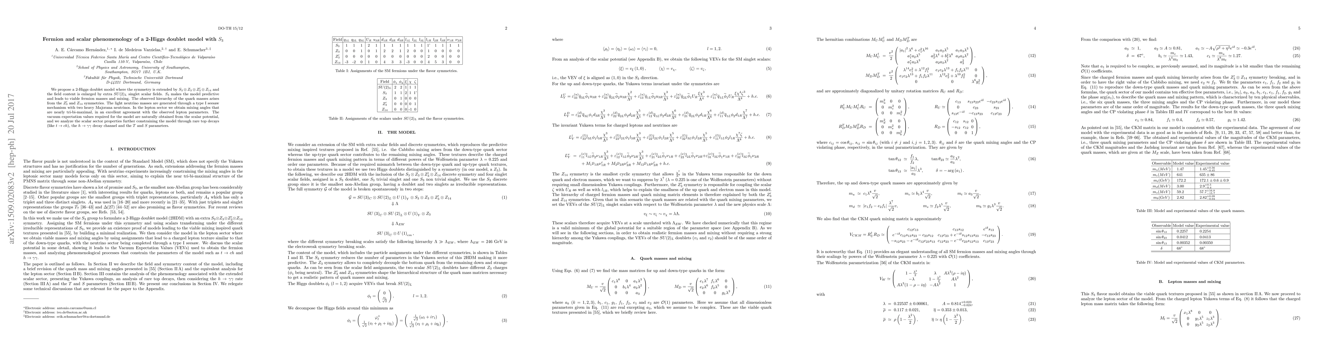 We propose a 2-Higgs doublet model where the symmetry is extended by $S_{3}\otimes Z_{3}\otimes Z_{3}^{\prime }\otimes Z_{14}$ and the field content is enlarged by extra $SU(2)_{L}$ singlet scalar fields. $S_3$ makes the model predictive and leads to viable fermion masses and mixing. The observed hierarchy of the quark masses arises from the $Z_{3}^{\prime }$ and $Z_{14}$ symmetries. The light neutrino masses are generated through a type I seesaw mechanism with two heavy Majorana neutrinos. In the lepton sector we obtain mixing angles that are nearly tri-bi-maximal, in an excellent agreement with the observed lepton parameters. The vacuum expectation values required for the model are naturally obtained from the scalar potential, and we analyze the scalar sector properties further constraining the model through the $\gamma \gamma$ decay channel and the $T$ and $S$ parameters.