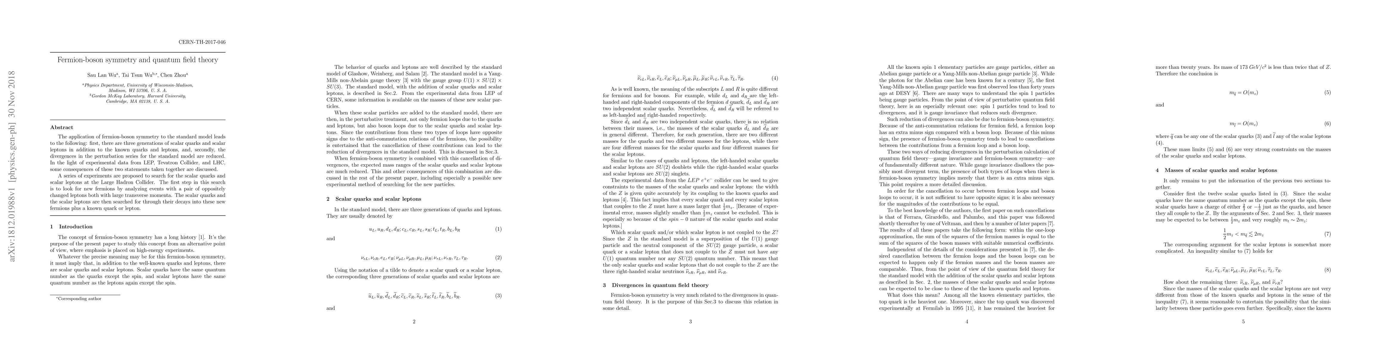 The application of fermion-boson symmetry to the standard model leads to the following: first, there are three generations of scalar quarks and scalar leptons in addition to the known quarks and leptons, and, secondly, the divergences in the perturbation series for the standard model are reduced. In the light of experimental data from LEP, Tevatron Collider, and LHC, some consequences of these two statements taken together are discussed. A series of experiments are proposed to search for the scalar quarks and scalar leptons at the Large Hadron Collider. The first step in this search is to look for new fermions by analyzing events with a pair of oppositely changed leptons both with large transverse momenta. The scalar quarks and the scalar leptons are then searched for through their decays into these new fermions plus a known quark or lepton.