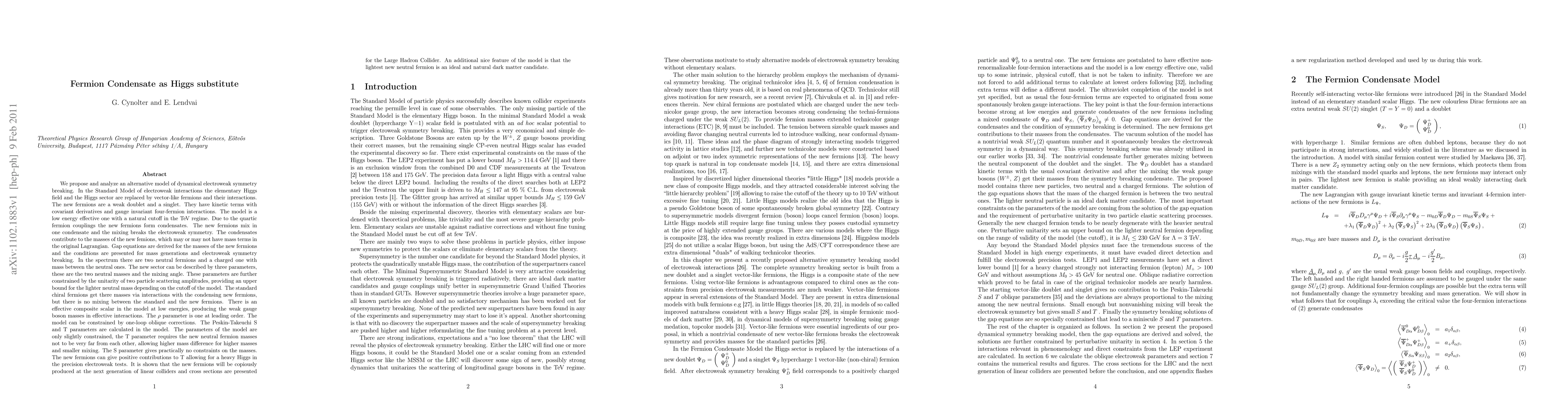 A dynamical symmetry breaking model of electroweak interactions is investigated based on strongly interacting fermions. Vector-like fermions of different representations of the weak SU(2) form a symmetry breaking condensate and generate the lepton and quark masses. The weak gauge bosons get their usual standard model masses from a gauge invariant effective Lagrangian of a doublet scalar field composed of the new fermion fields. Gap equations are derived and the conditions for finding a symmetry breaking solution are presented. The parameters of the model are constrained further by perturbative unitarity. The oblique electroweak corrections only slightly constrain the model. It is shown that the new charged fermions are produced at the next linear colliders in large number and the cross section for the LHC is presented.